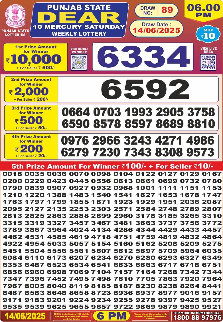 पंजाब 10 लाटरी का शाम 6 बजे का रिज़ल्ट दिनांक 14.6.25