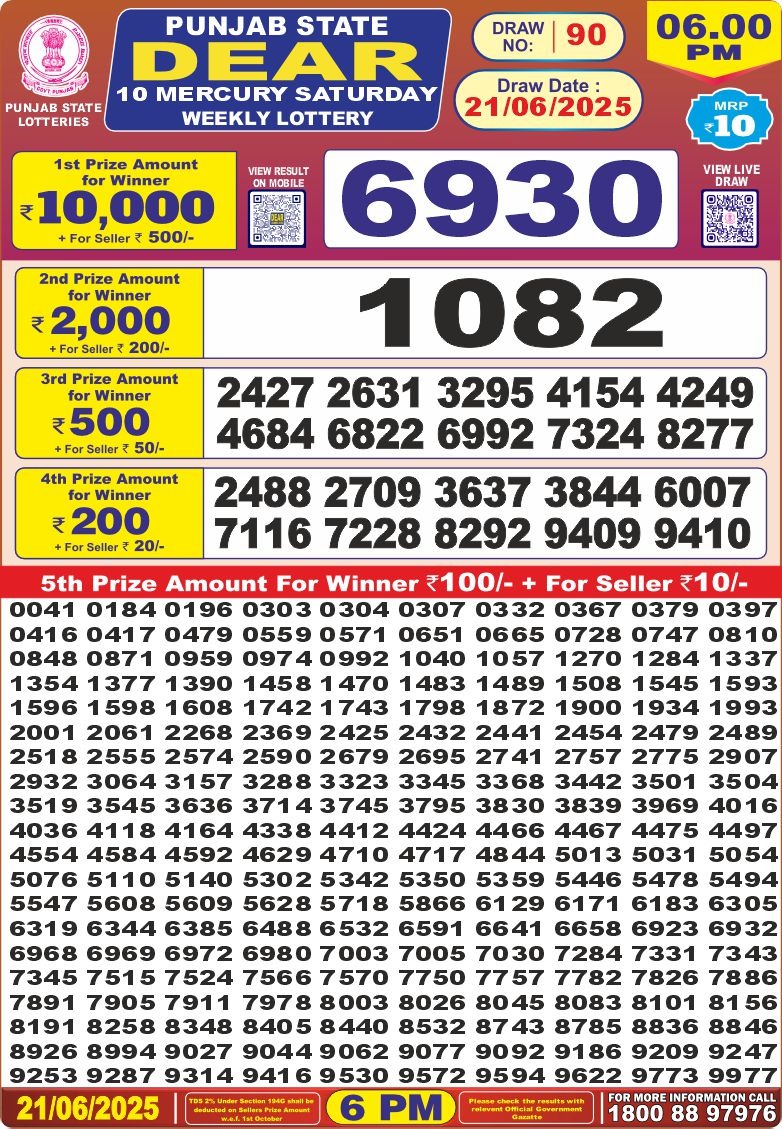 पंजाब 10 लाटरी का शाम 6 बजे का रिज़ल्ट दिनांक 21.6.25