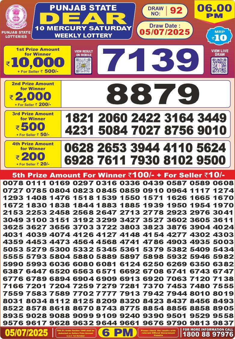 पंजाब 10 लाटरी का शाम 6 बजे का रिज़ल्ट दिनांक 05.7.25