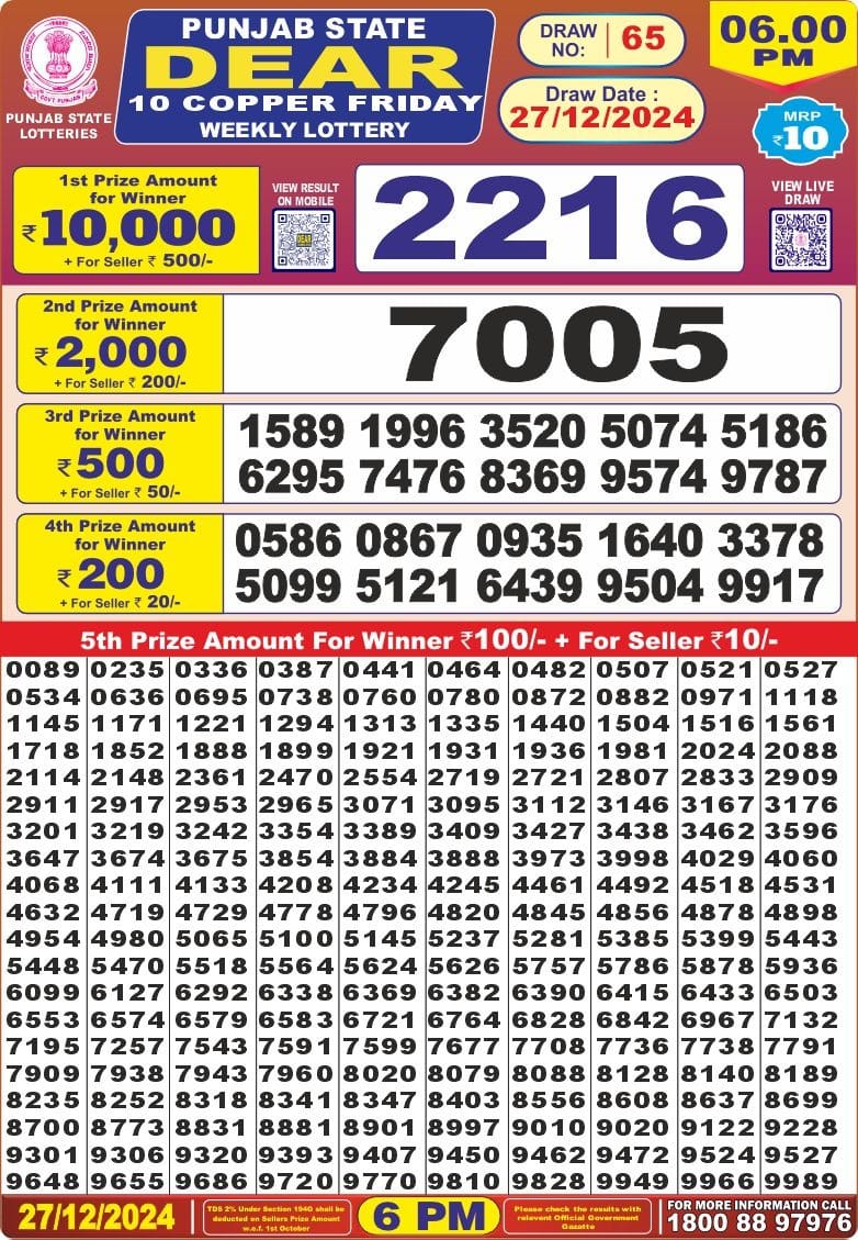 Nagaland State Lotteries was established in the year 1972 under the supervision of the Finance Department to generate a dependable source of revenue for the State Government. Nagaland State Lottery is held every day of the week at three different times of the day, Morning, Day, and Evening. Every day, the lottery is held under a different name with some difference in the prize money with the top prize worth ₹1 Crore (including Super Prize amount). The daily lotteries hosted by Nagaland State include Dear Morning Lottery, Dear Day Lottery, and Dear Evening Lottery which costs 6 Rupees for each ticket.