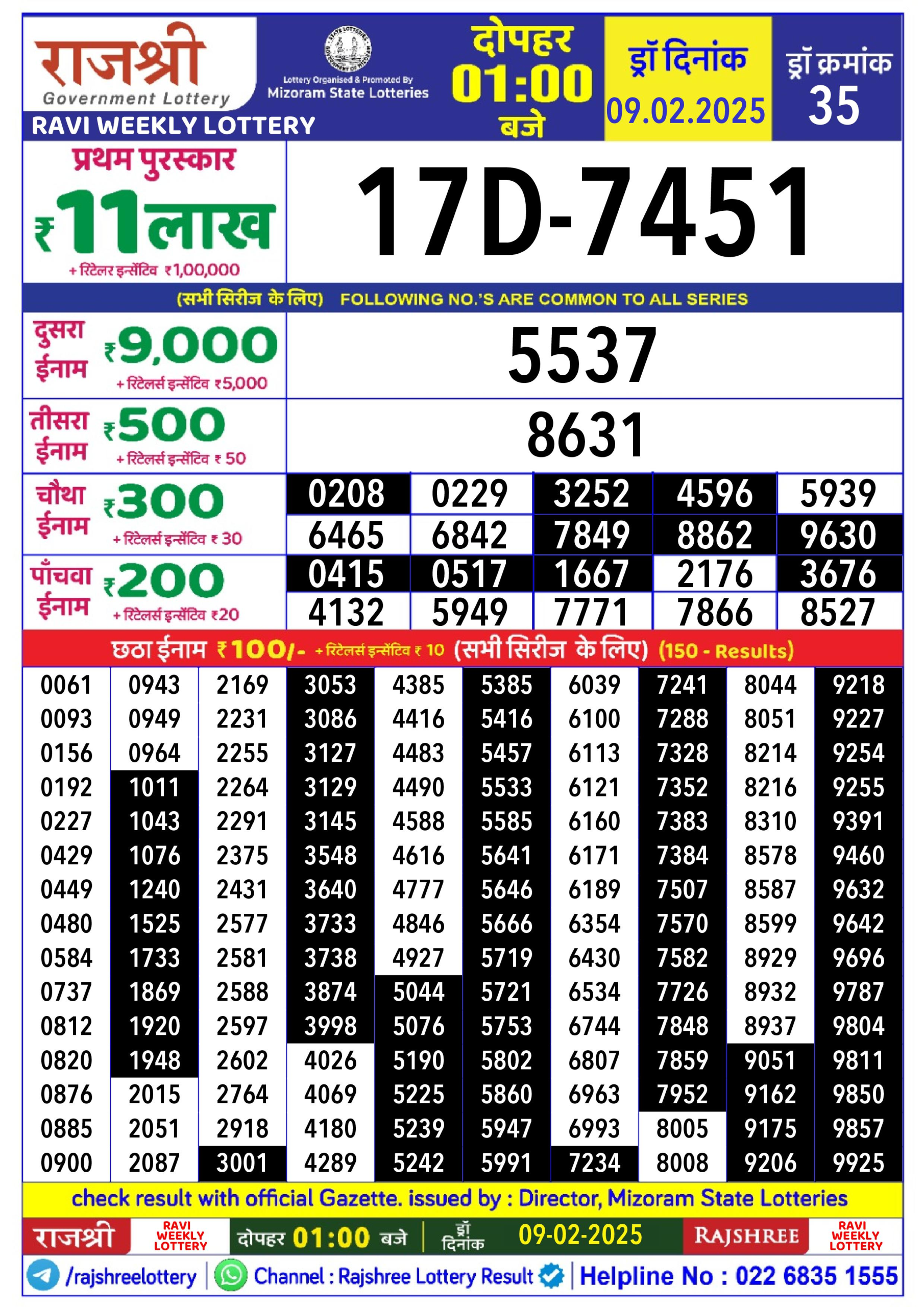 राजश्री लाटरी का दोपहर 1 बजे का रिज़ल्ट दिनांक 03.12.25