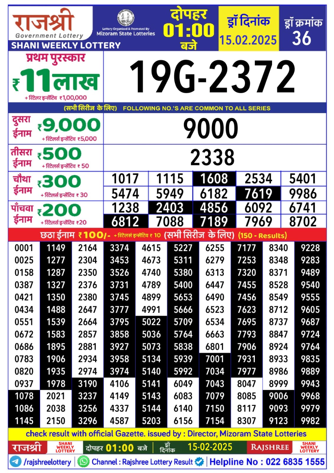 राजश्री लाटरी का दोपहर 1 बजे का रिज़ल्ट दिनांक 09.12.25
