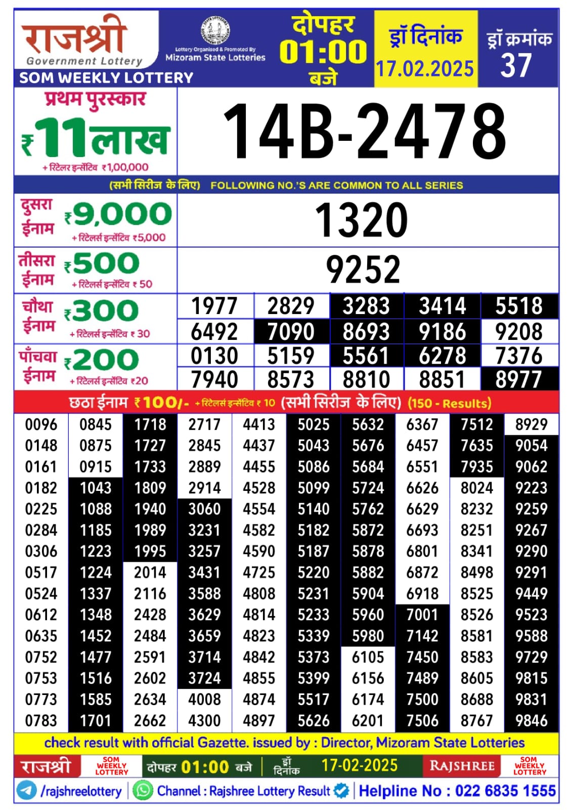 राजश्री लाटरी का दोपहर 1 बजे का रिज़ल्ट दिनांक 11.12.25