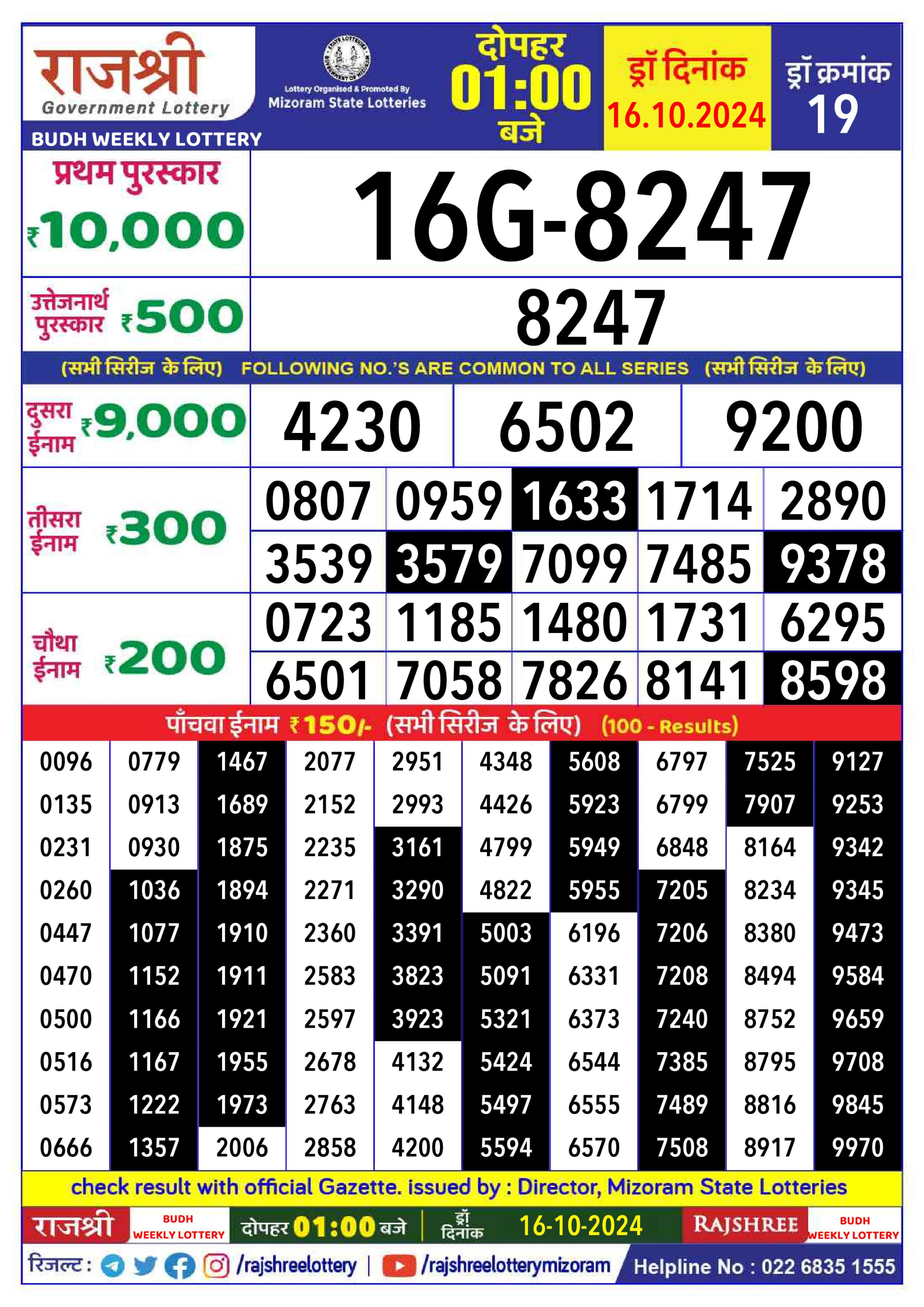 राजश्री लाटरी का दोपहर 1 बजे का रिज़ल्ट दिनांक 7.8.25