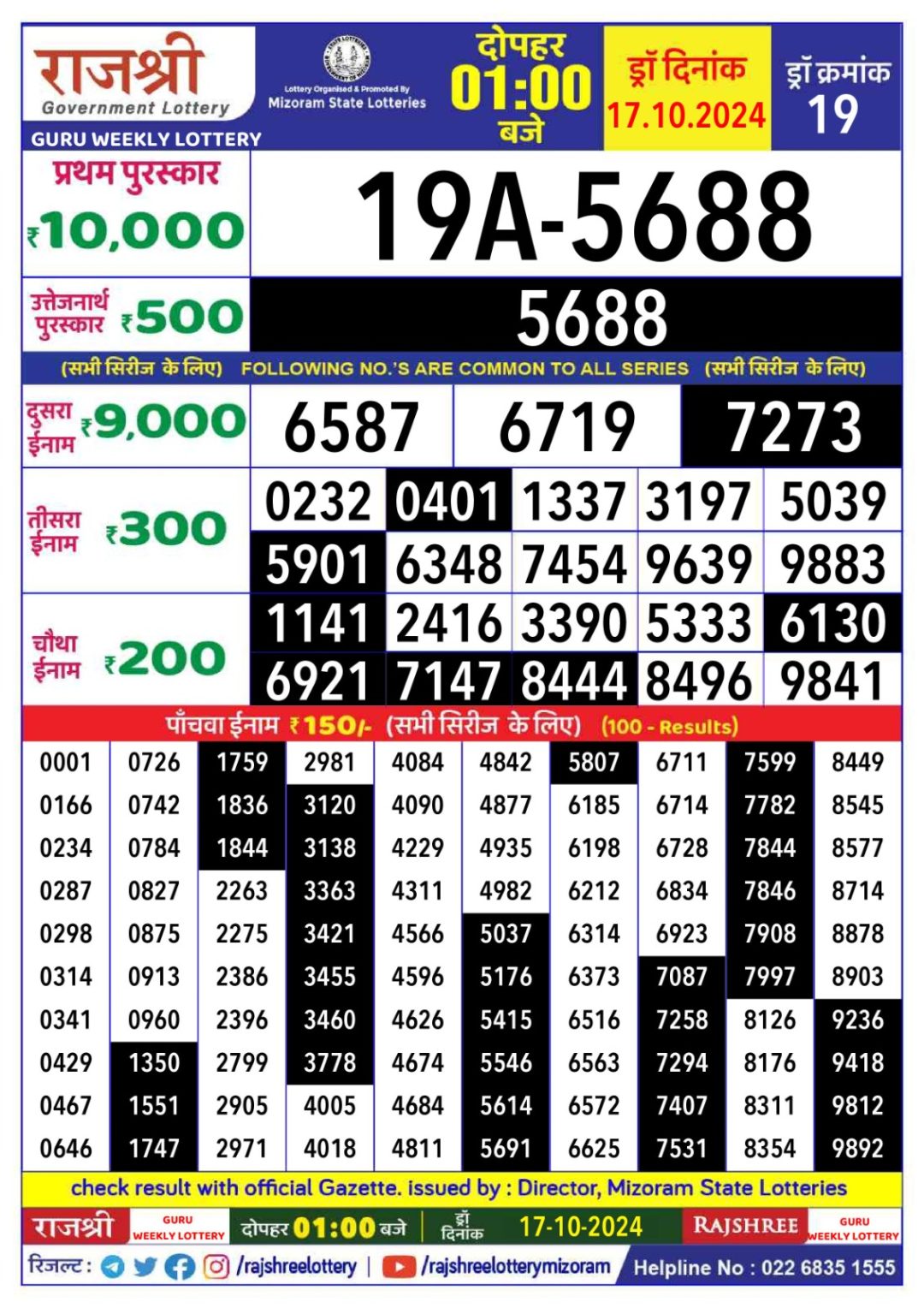 राजश्री लाटरी का दोपहर 1 बजे का रिज़ल्ट दिनांक 6.8.25