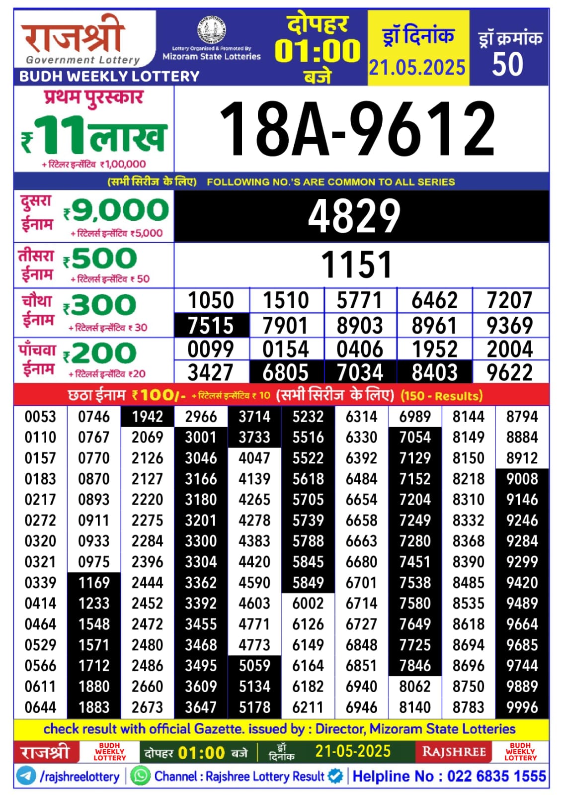 राजश्री लाटरी का दोपहर 1 बजे का रिज़ल्ट दिनांक 21.5.25