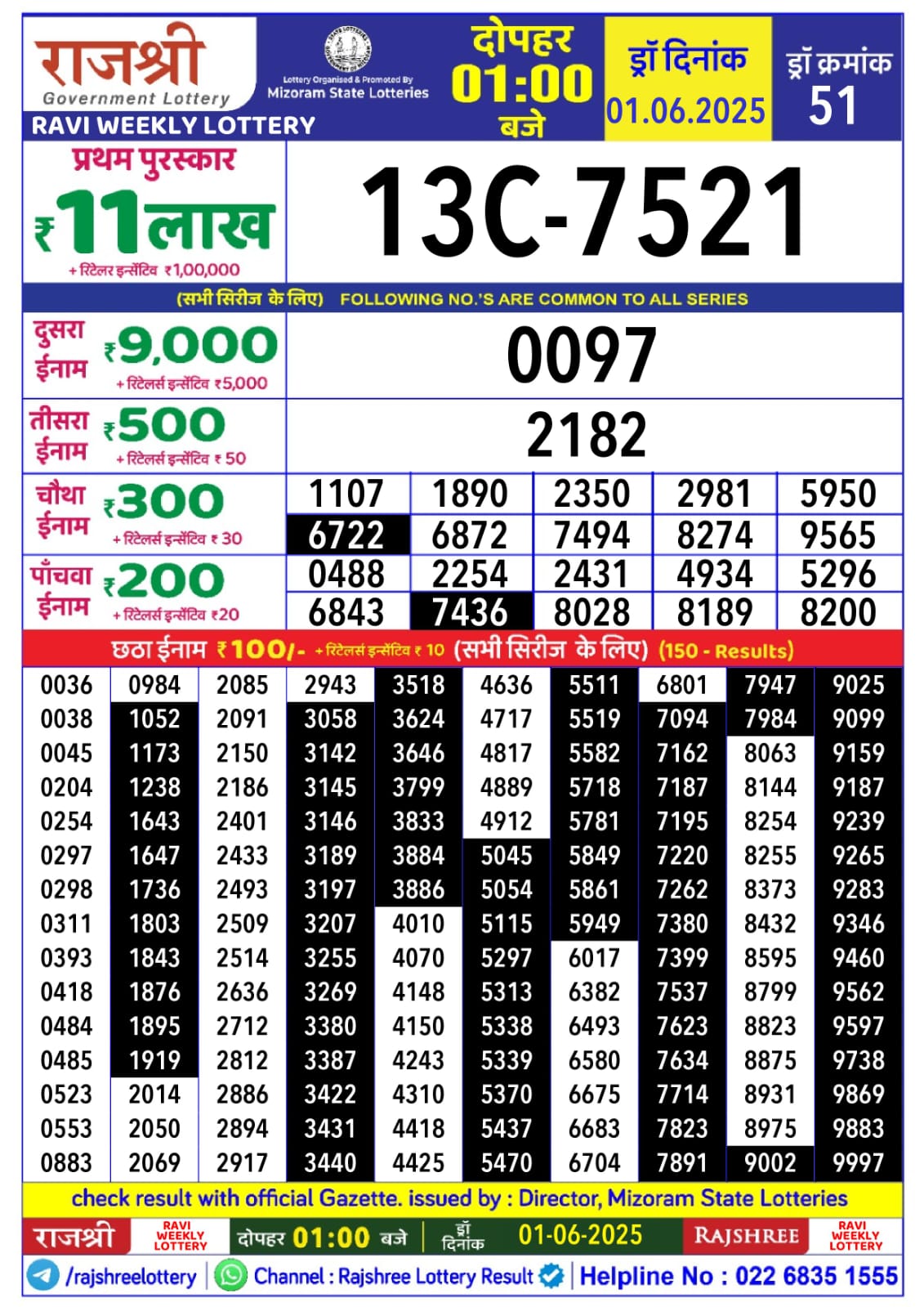 राजश्री लाटरी का दोपहर 1 बजे का रिज़ल्ट दिनांक 1.6.25