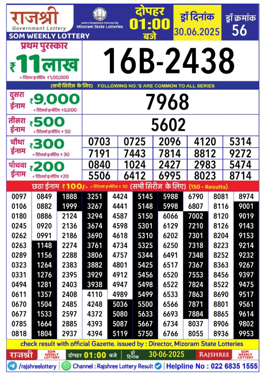 राजश्री लाटरी का दोपहर 1 बजे का रिज़ल्ट दिनांक 30.6.25