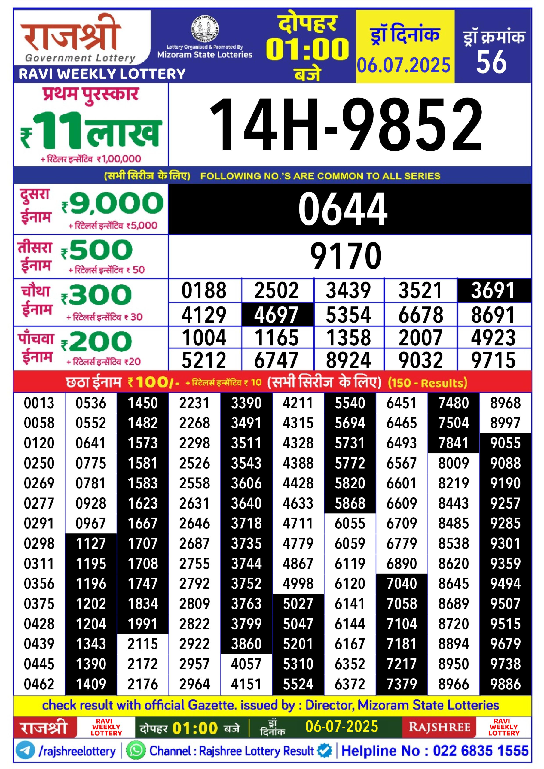 राजश्री लाटरी का दोपहर 1 बजे का रिज़ल्ट दिनांक 06.7.25