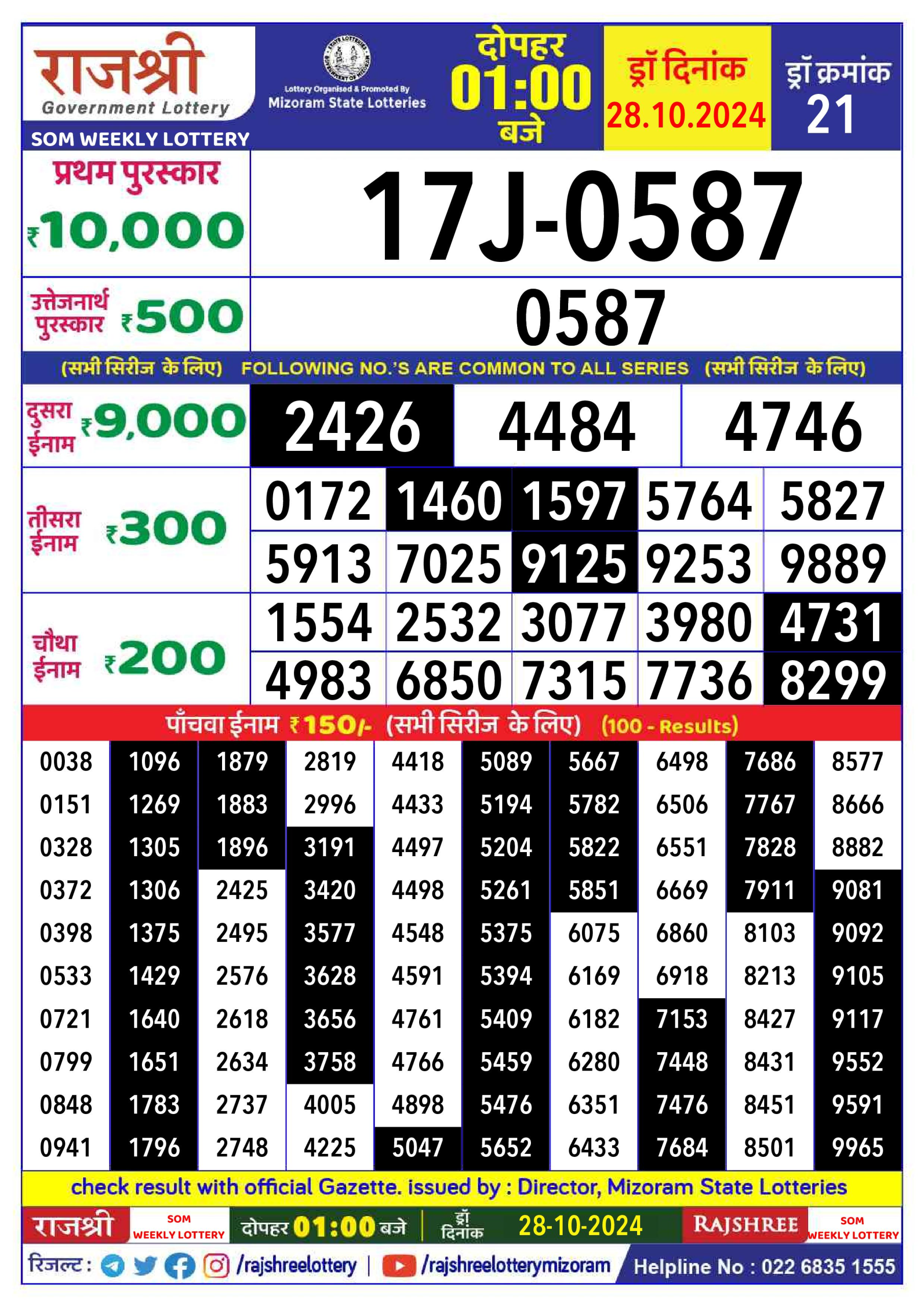 राजश्री लाटरी का दोपहर 1 बजे का रिज़ल्ट दिनांक 27.8.25