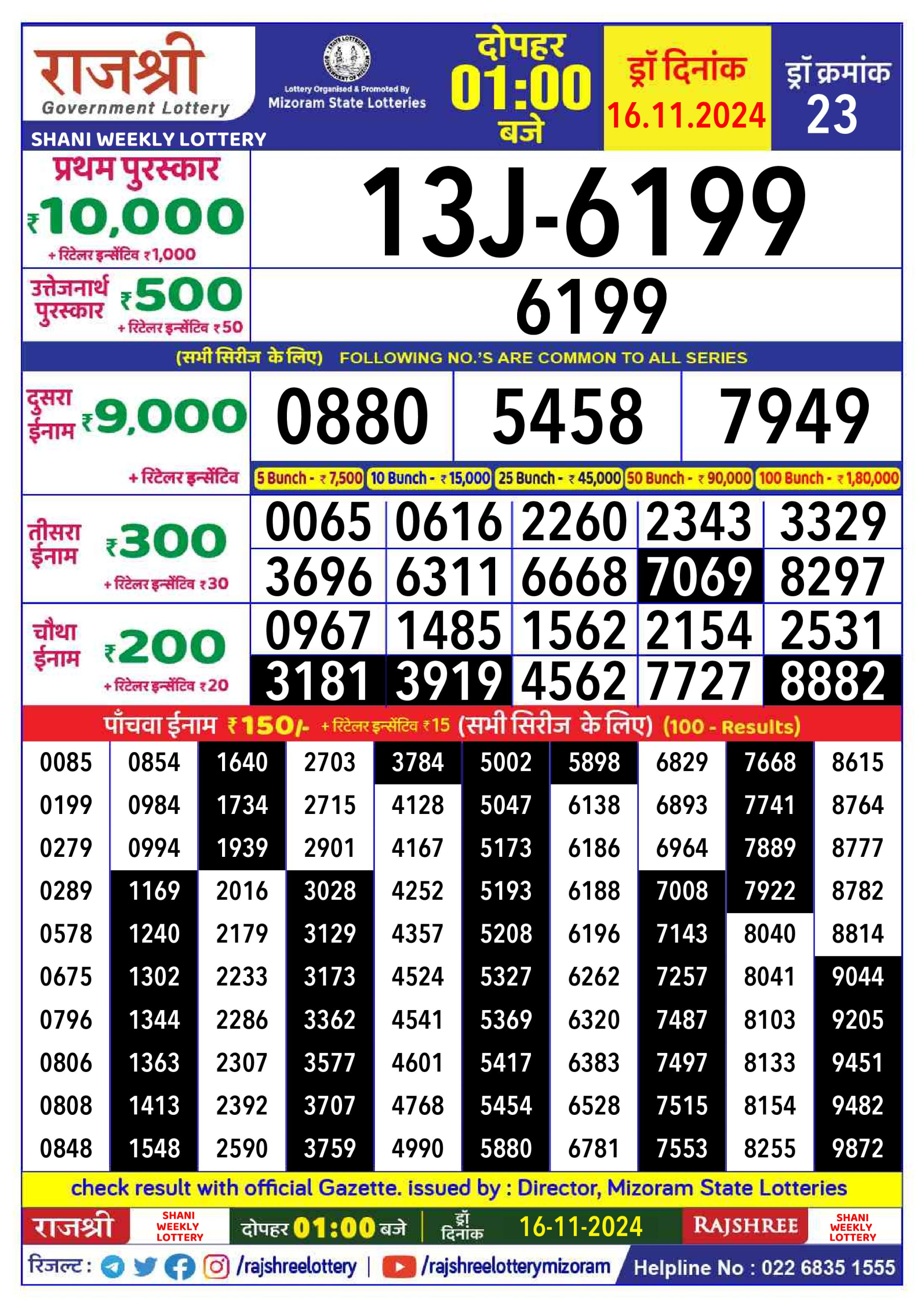 राजश्री लाटरी का दोपहर 1 बजे का रिज़ल्ट दिनांक 09.9.25