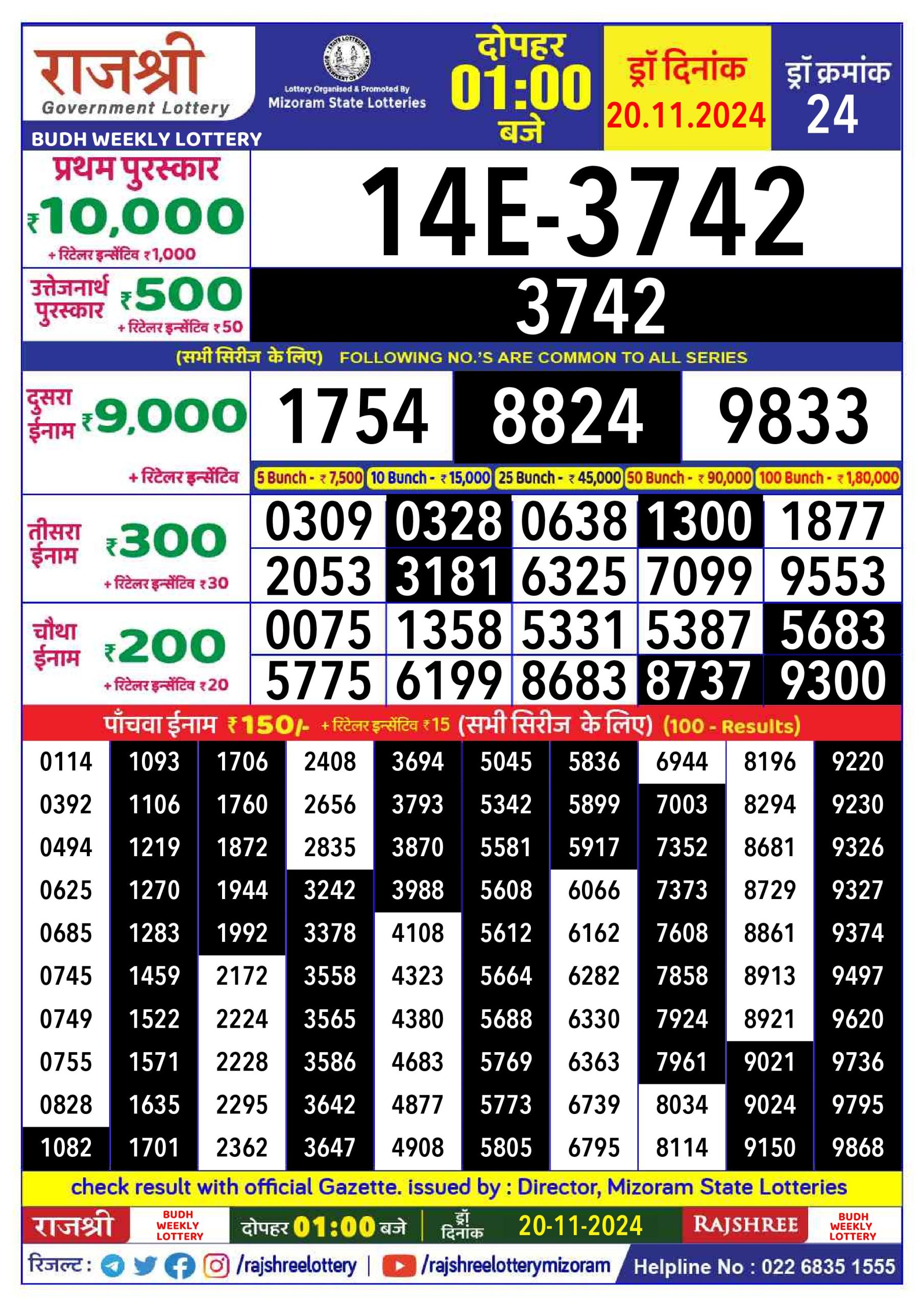 राजश्री लाटरी का दोपहर 1 बजे का रिज़ल्ट दिनांक 13.9.25