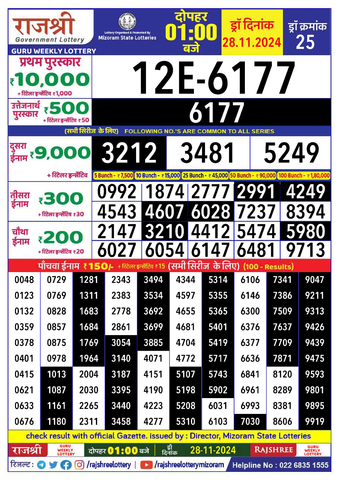 Nagaland State Lotteries was established in the year 1972 under the supervision of the Finance Department to generate a dependable source of revenue for the State Government. Nagaland State Lottery is held every day of the week at three different times of the day, Morning, Day, and Evening. Every day, the lottery is held under a different name with some difference in the prize money with the top prize worth ₹1 Crore (including Super Prize amount). The daily lotteries hosted by Nagaland State include Dear Morning Lottery, Dear Day Lottery, and Dear Evening Lottery which costs 6 Rupees for each ticket.