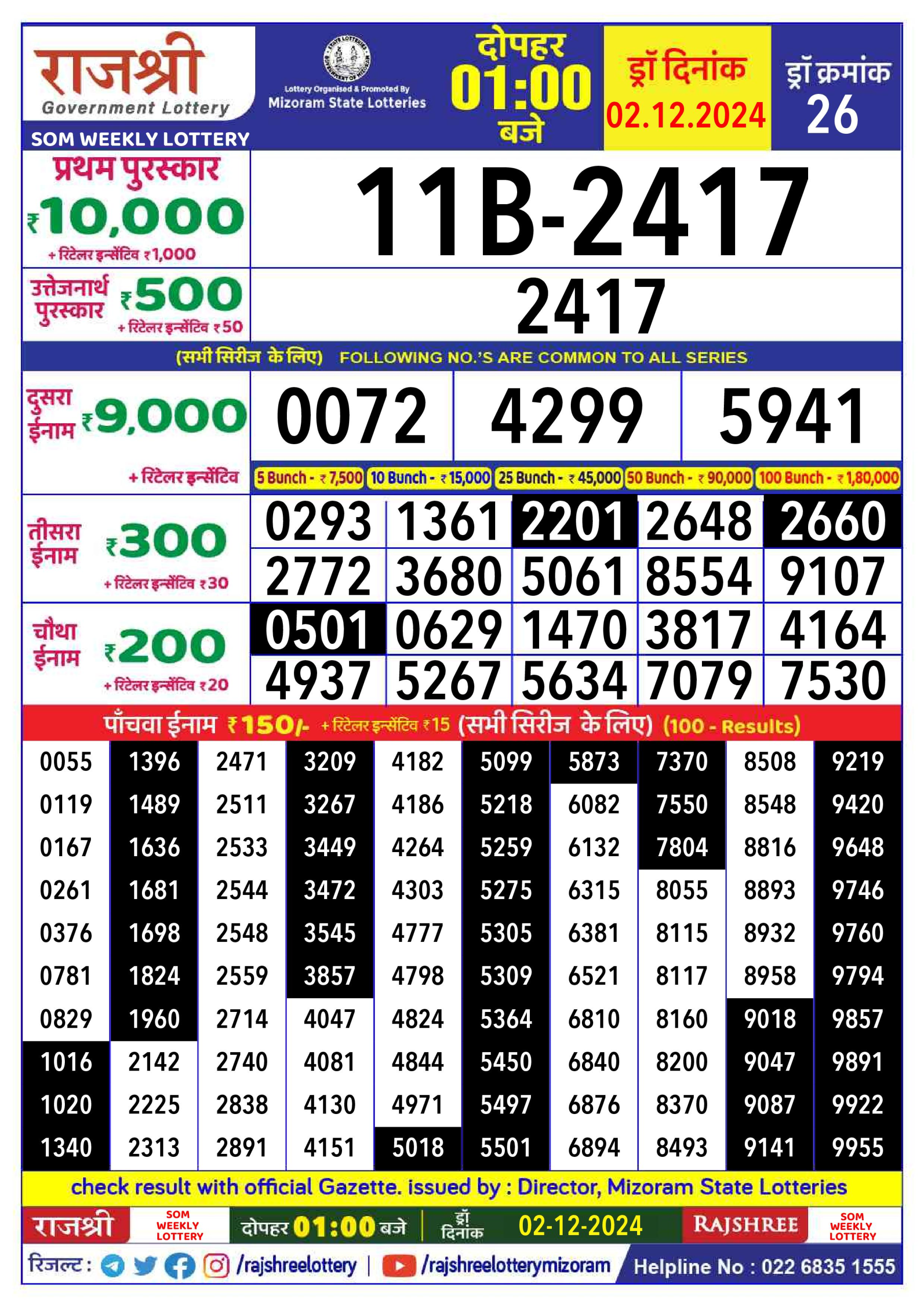 Nagaland State Lotteries was established in the year 1972 under the supervision of the Finance Department to generate a dependable source of revenue for the State Government. Nagaland State Lottery is held every day of the week at three different times of the day, Morning, Day, and Evening. Every day, the lottery is held under a different name with some difference in the prize money with the top prize worth ₹1 Crore (including Super Prize amount). The daily lotteries hosted by Nagaland State include Dear Morning Lottery, Dear Day Lottery, and Dear Evening Lottery which costs 6 Rupees for each ticket.