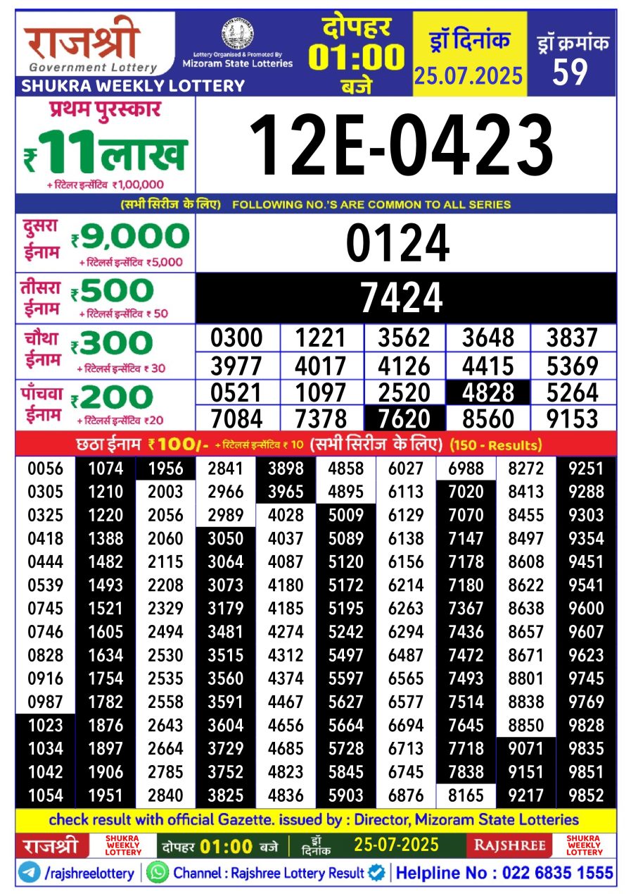 राजश्री लाटरी का दोपहर 1 बजे का रिज़ल्ट दिनांक 25.7.25