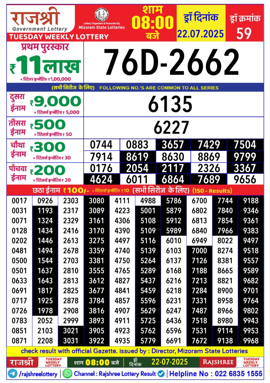 राजश्री लाटरी का रात 8 बजे का रिज़ल्ट दिनांक 22.7.25