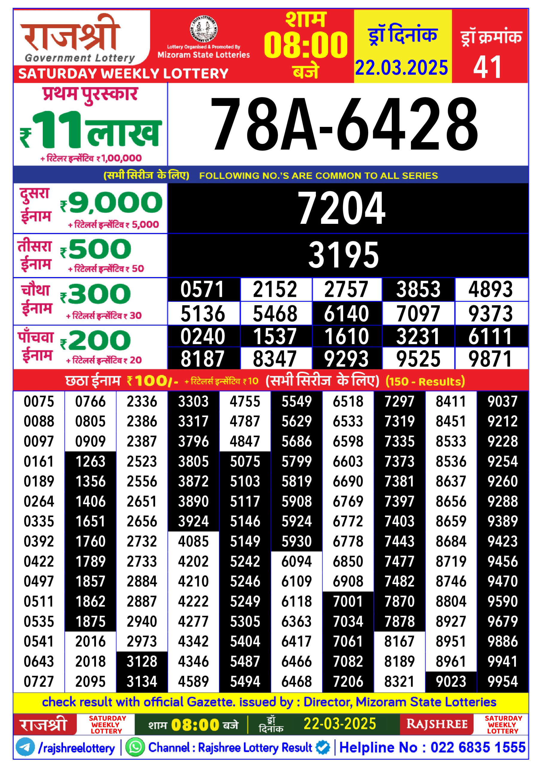 राजश्री लाटरी का रात 8 बजे का रिज़ल्ट दिनांक 07.11.25