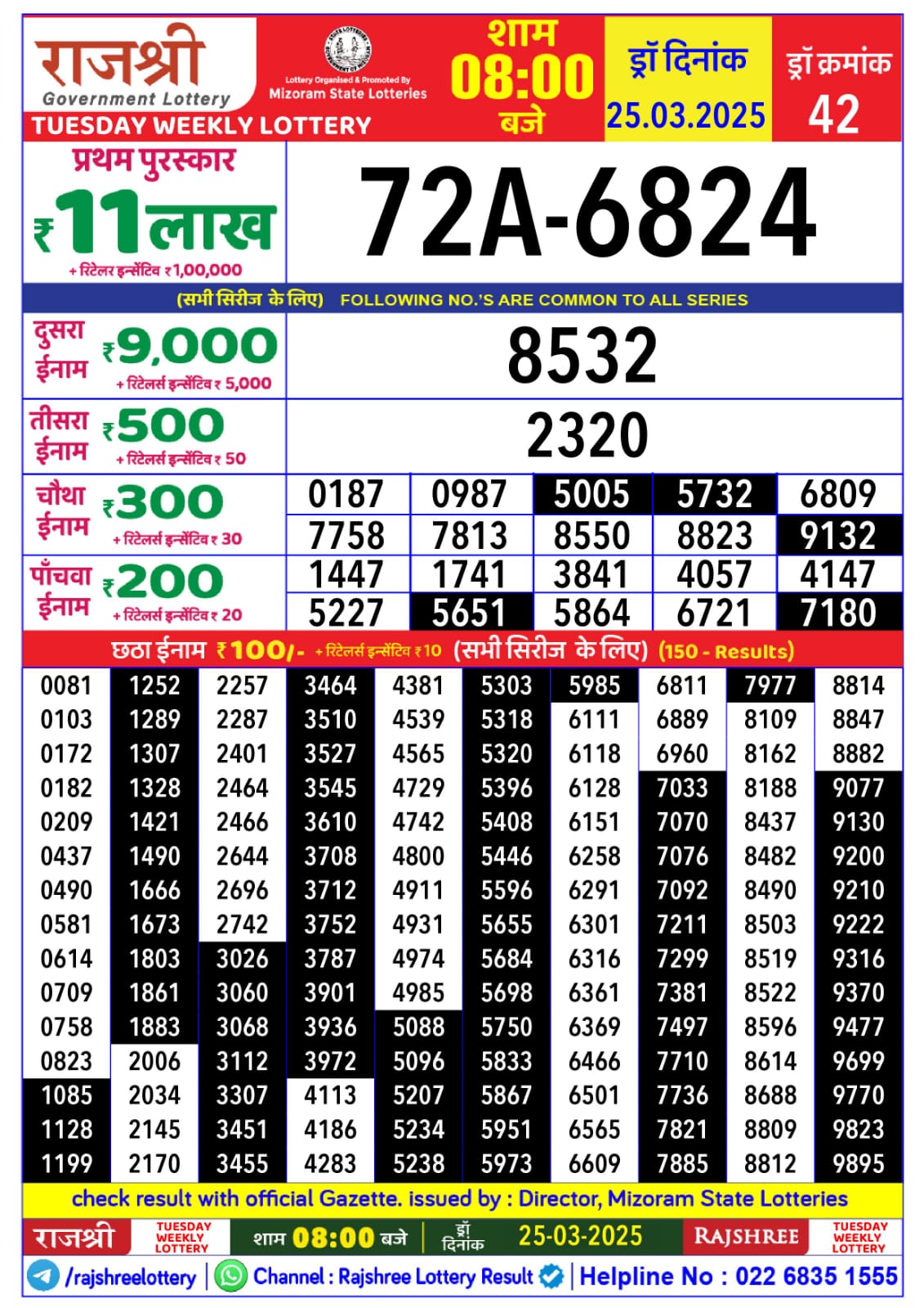 राजश्री लाटरी का रात 8 बजे का रिज़ल्ट दिनांक 10.11.25