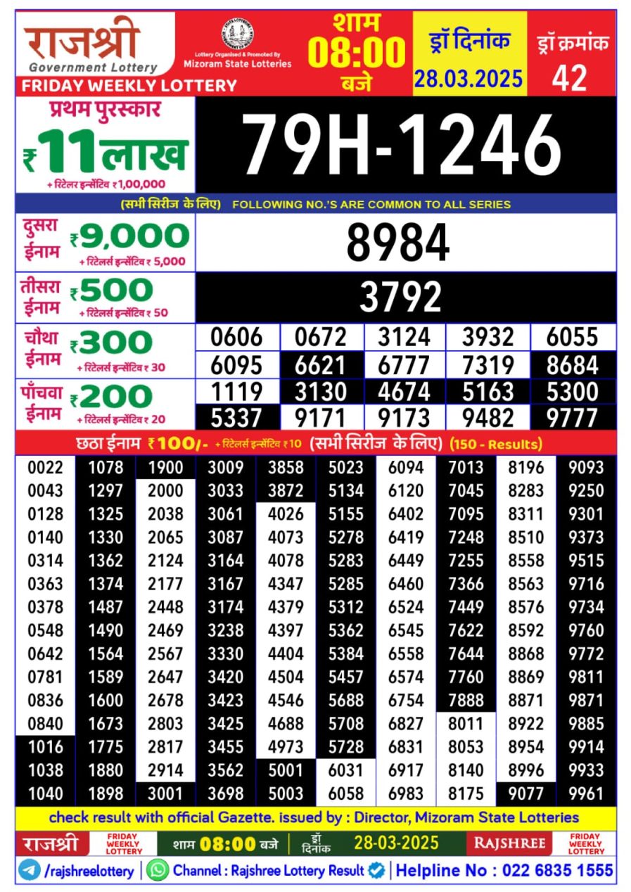 राजश्री लाटरी का रात 8 बजे का रिज़ल्ट दिनांक 13.11.25
