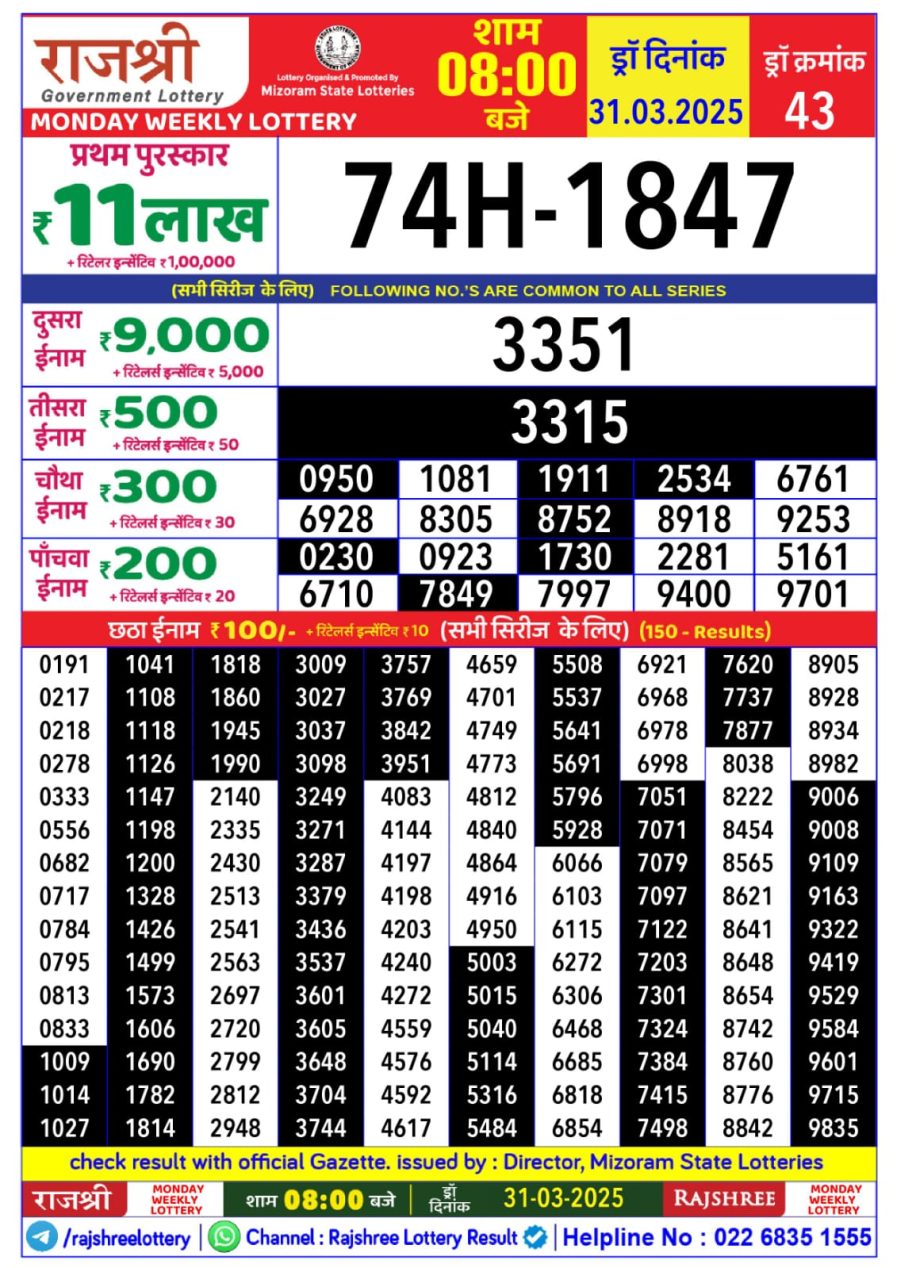 राजश्री लाटरी का रात 8 बजे का रिज़ल्ट दिनांक 16.11.25