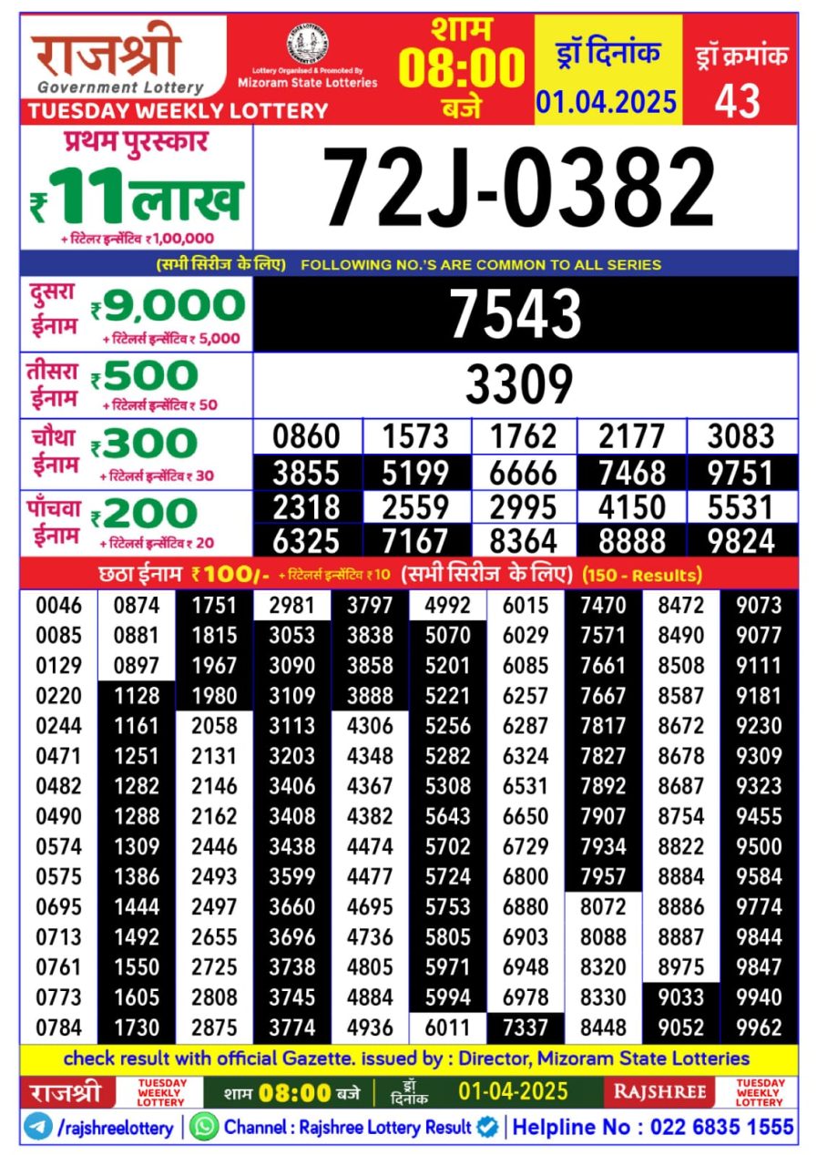 राजश्री लाटरी का रात 8 बजे का रिज़ल्ट दिनांक 17.11.25