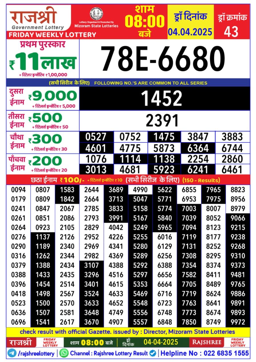 राजश्री लाटरी का रात 8 बजे का रिज़ल्ट दिनांक 20.11.25