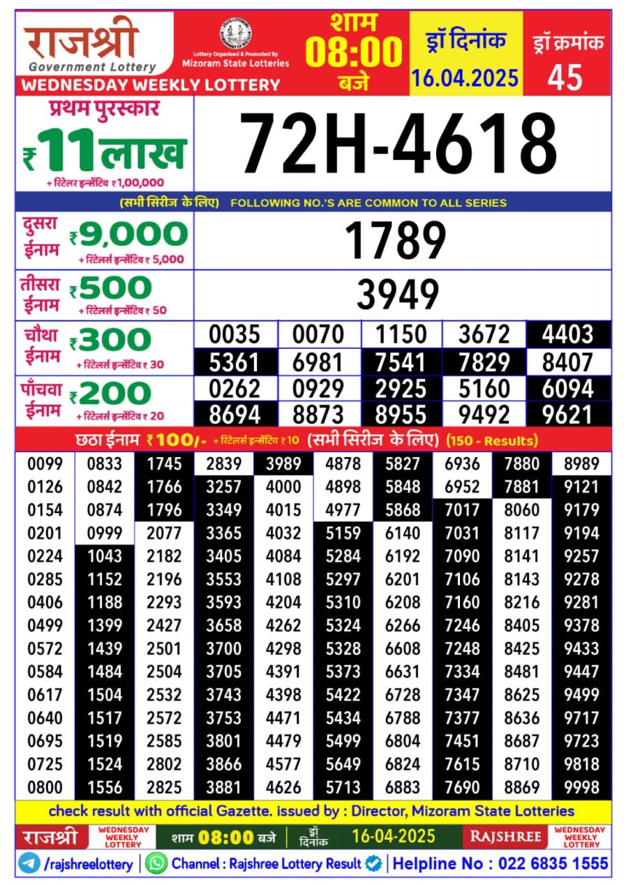 Nagaland State Lotteries was established in the year 1972 under the supervision of the Finance Department to generate a dependable source of revenue for the State Government. Nagaland State Lottery is held every day of the week at three different times of the day, Morning, Day, and Evening. Every day, the lottery is held under a different name with some difference in the prize money with the top prize worth ₹1 Crore (including Super Prize amount). The daily lotteries hosted by Nagaland State include Dear Morning Lottery, Dear Day Lottery, and Dear Evening Lottery which costs 6 Rupees for each ticket.