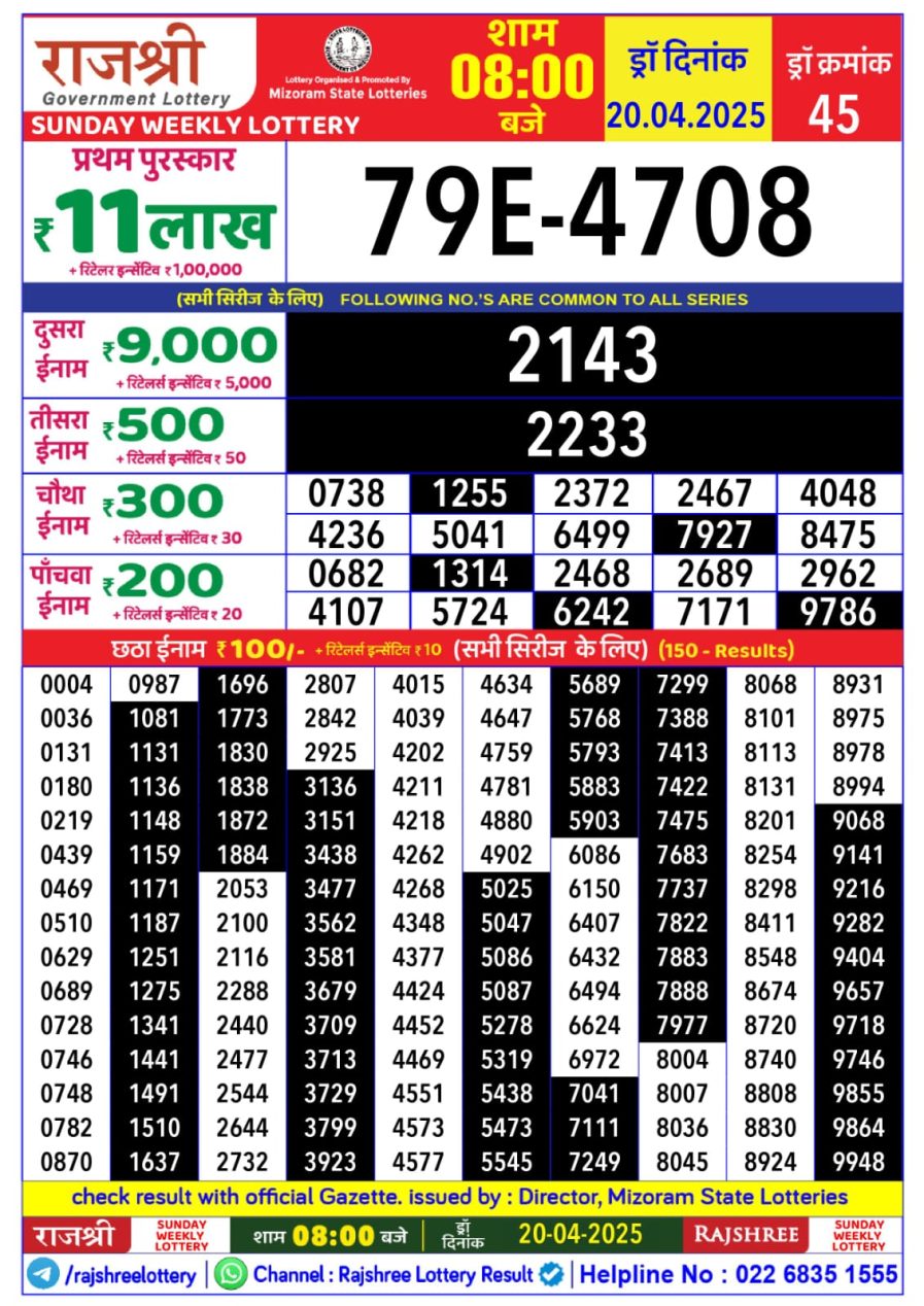 राजश्री लाटरी का रात 8 बजे का रिज़ल्ट दिनांक 08.12.25