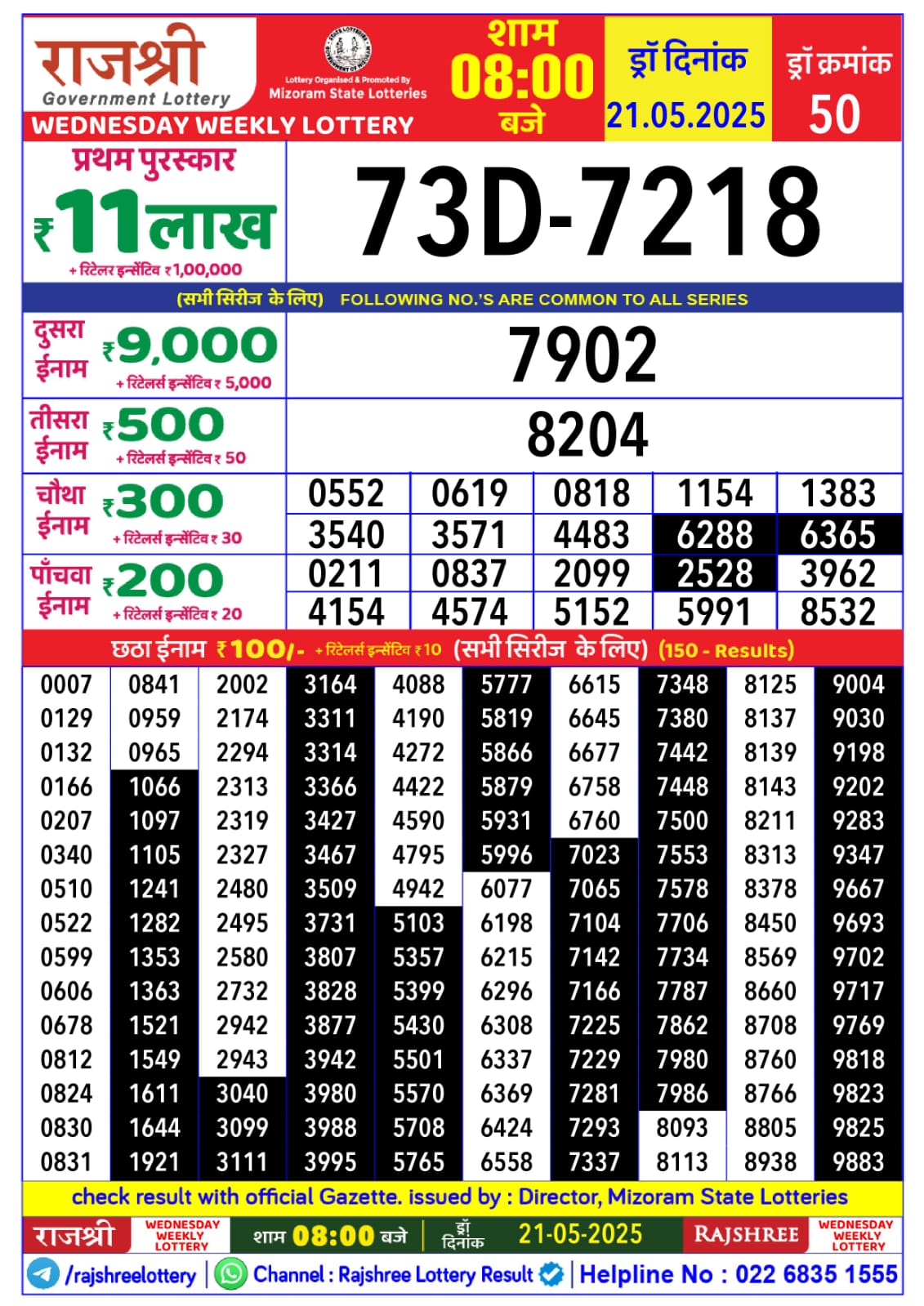 राजश्री लाटरी का रात 8 बजे का रिज़ल्ट दिनांक 21.5.25
