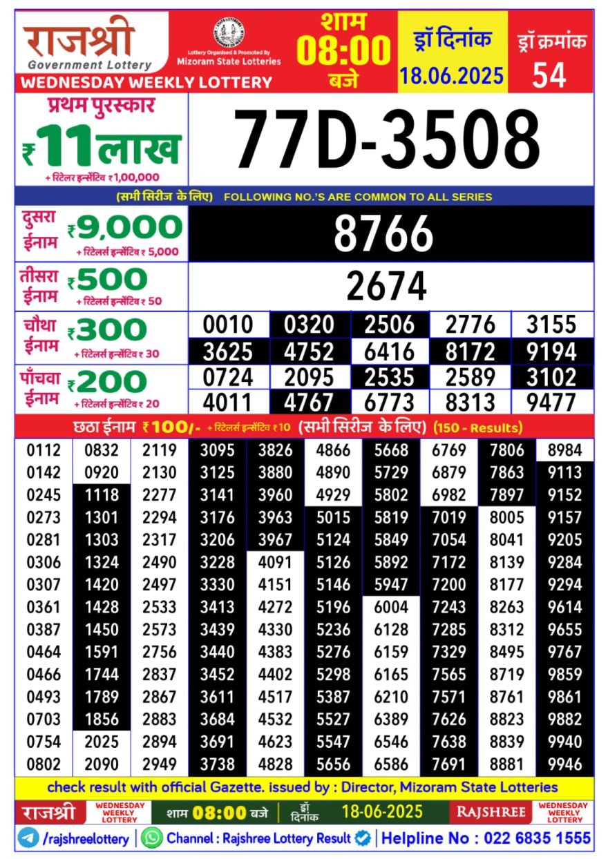 राजश्री लाटरी का रात 8 बजे का रिज़ल्ट दिनांक 18.6.25