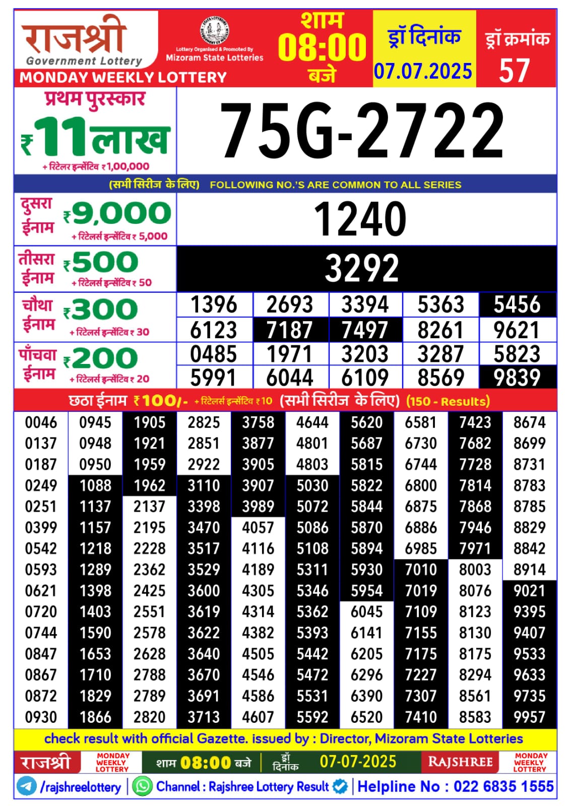 राजश्री लाटरी का रात 8 बजे का रिज़ल्ट दिनांक 07.7.25