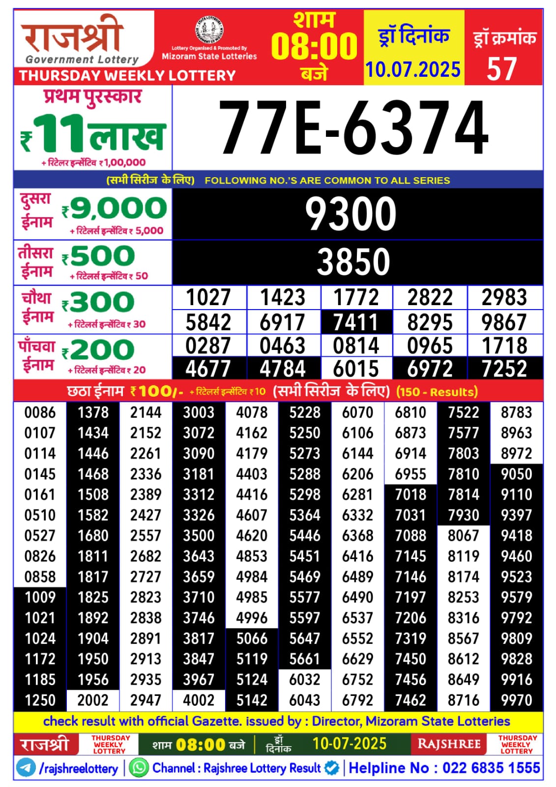 राजश्री लाटरी का रात 8 बजे का रिज़ल्ट दिनांक 10.7.25