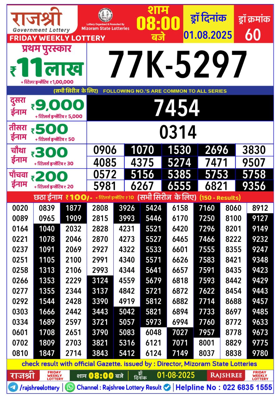 राजश्री लाटरी का रात 8 बजे का रिज़ल्ट दिनांक 1.8.25