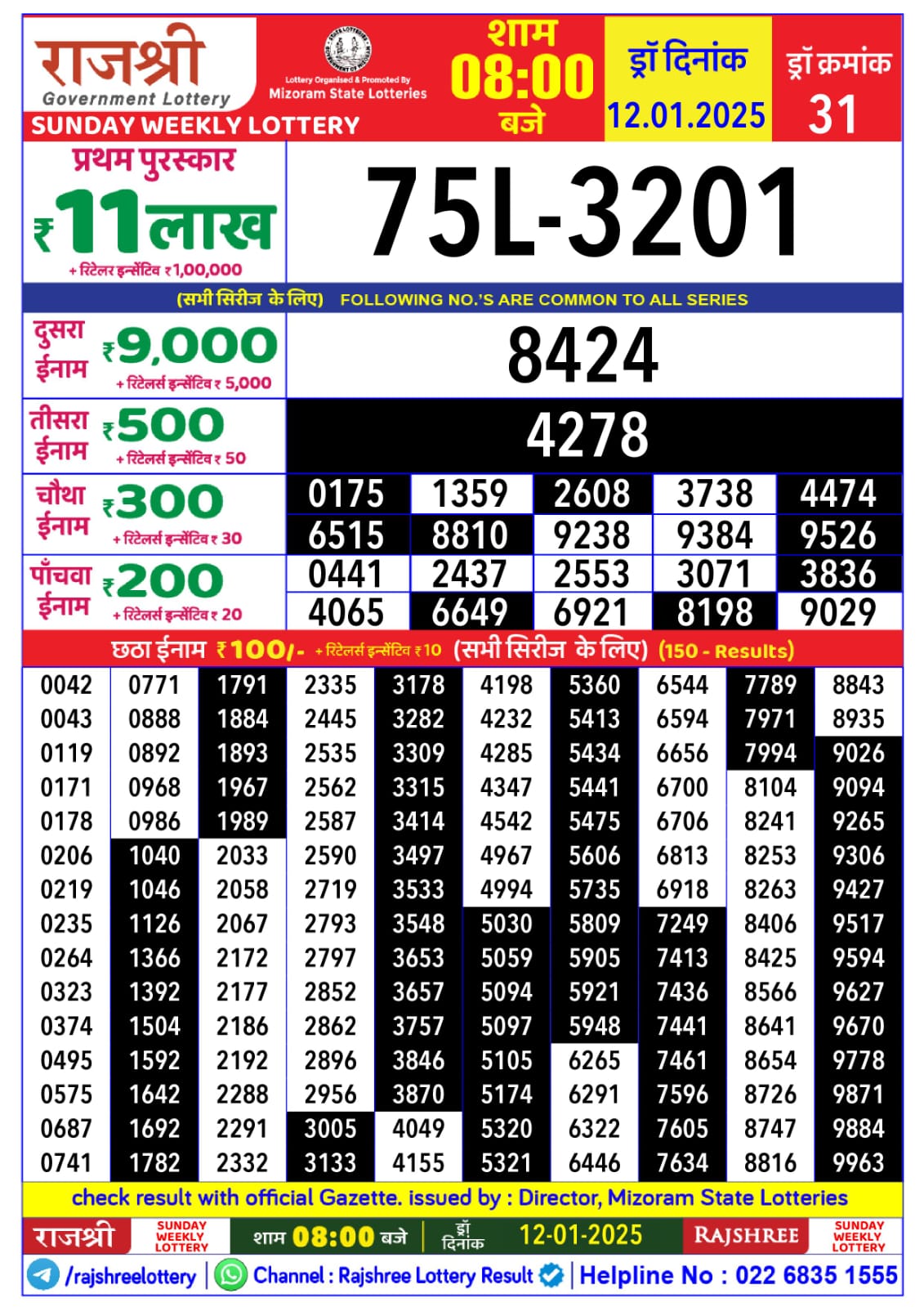 राजश्री लाटरी का रात 8 बजे का रिज़ल्ट दिनांक 18.8.25