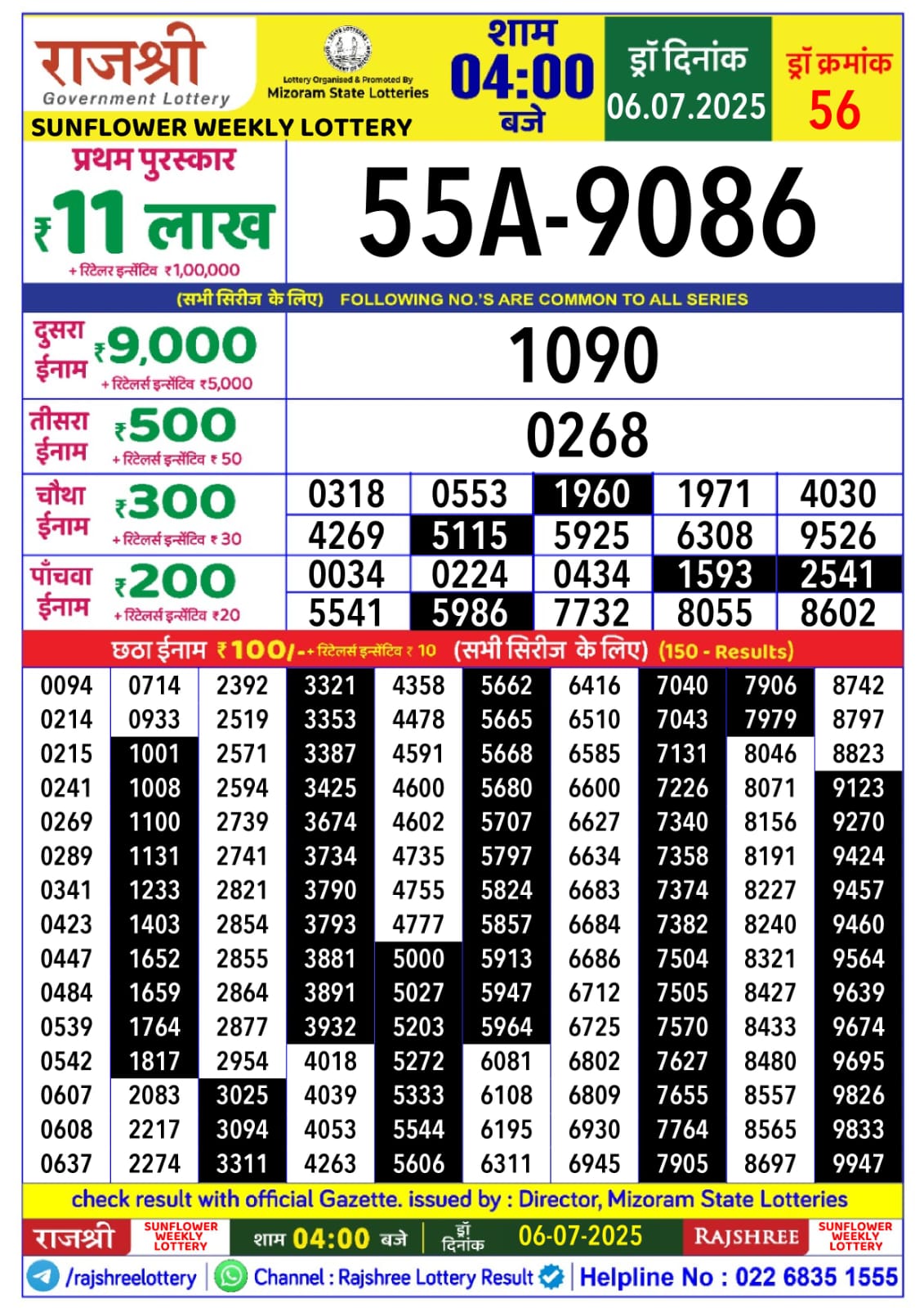 राजश्री लाटरी का 4 बजे का रिज़ल्ट दिनांक 06.7.25