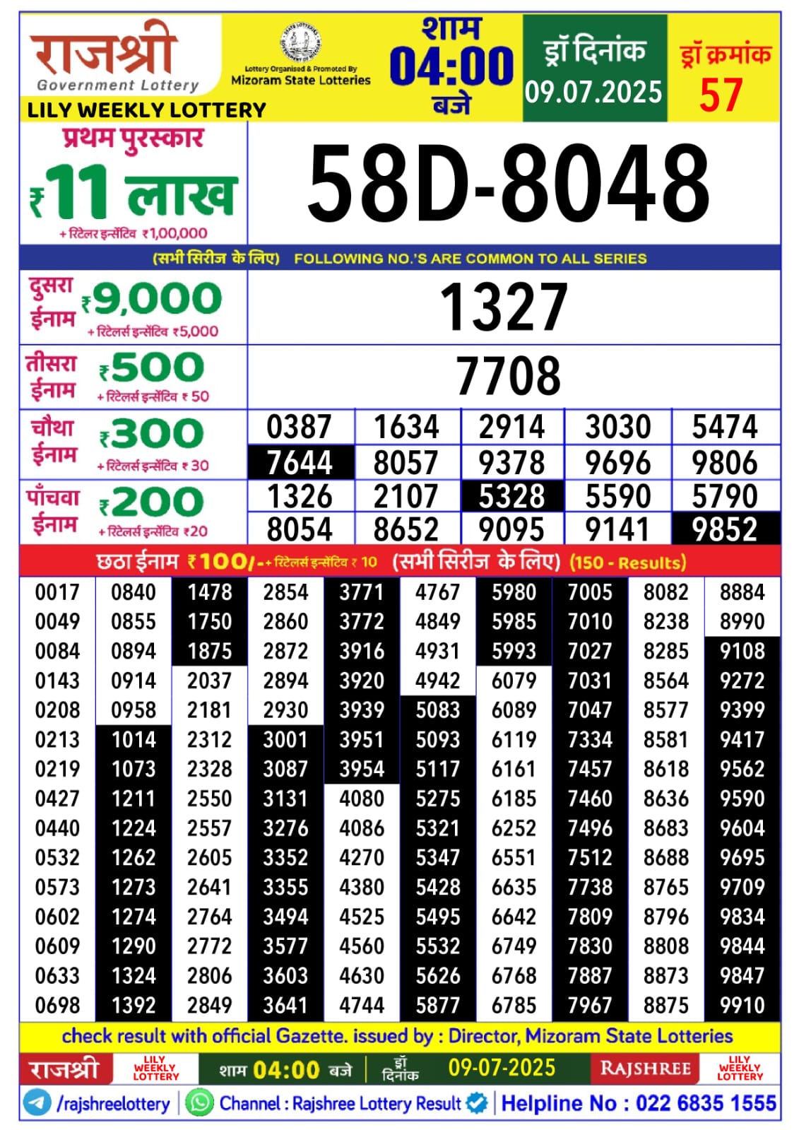 राजश्री लाटरी का 4 बजे का रिज़ल्ट दिनांक 09.7.25