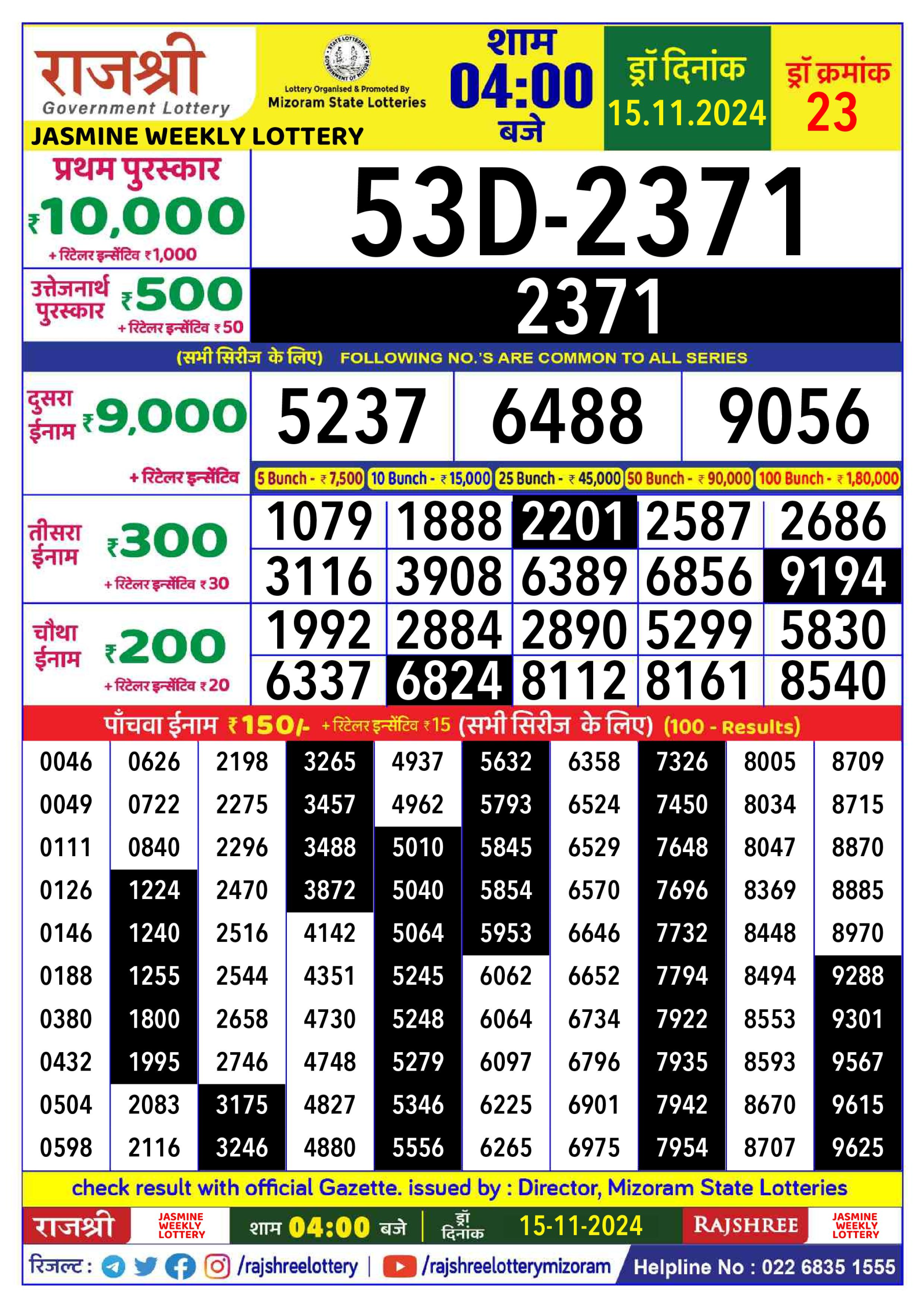 Nagaland State Lotteries was established in the year 1972 under the supervision of the Finance Department to generate a dependable source of revenue for the State Government. Nagaland State Lottery is held every day of the week at three different times of the day, Morning, Day, and Evening. Every day, the lottery is held under a different name with some difference in the prize money with the top prize worth ₹1 Crore (including Super Prize amount). The daily lotteries hosted by Nagaland State include Dear Morning Lottery, Dear Day Lottery, and Dear Evening Lottery which costs 6 Rupees for each ticket.