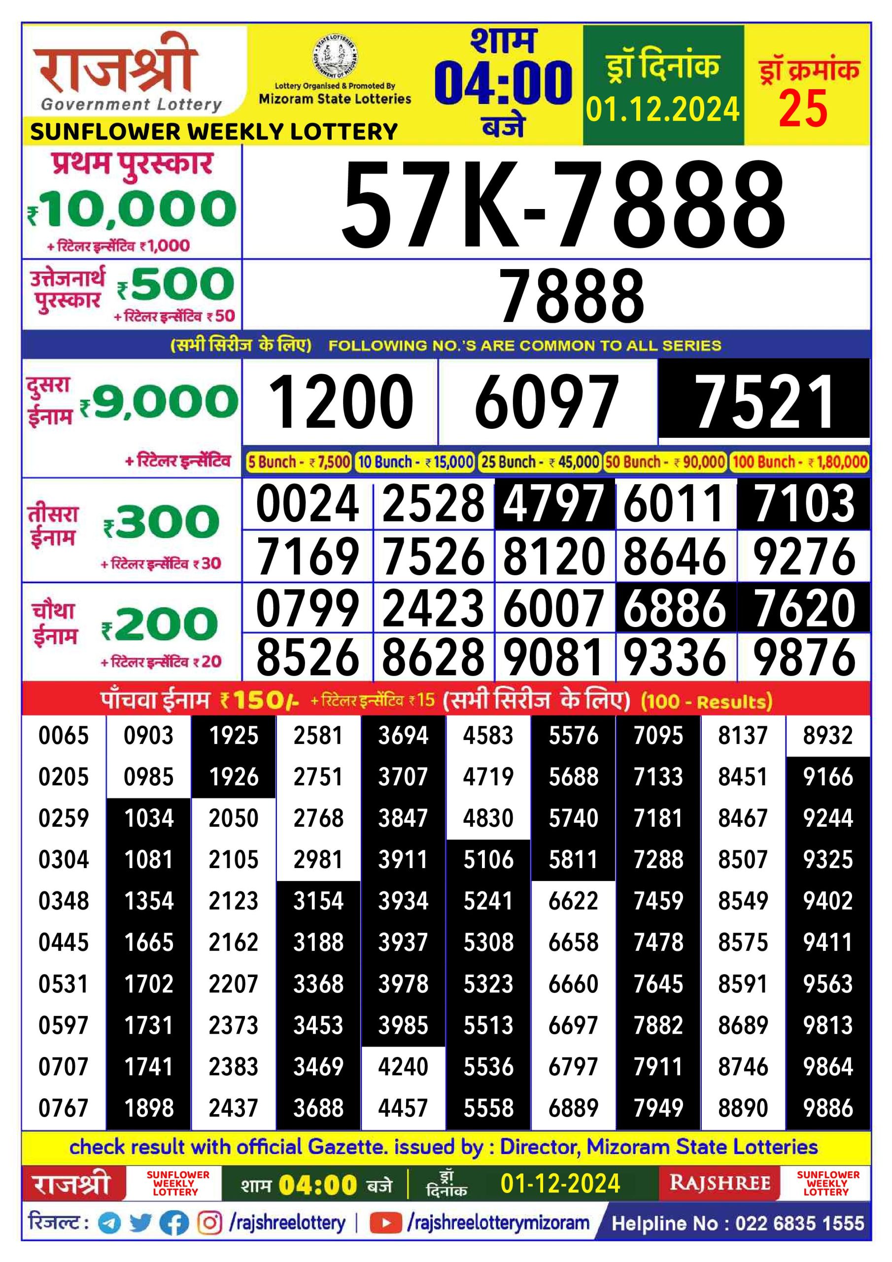 Nagaland State Lotteries was established in the year 1972 under the supervision of the Finance Department to generate a dependable source of revenue for the State Government. Nagaland State Lottery is held every day of the week at three different times of the day, Morning, Day, and Evening. Every day, the lottery is held under a different name with some difference in the prize money with the top prize worth ₹1 Crore (including Super Prize amount). The daily lotteries hosted by Nagaland State include Dear Morning Lottery, Dear Day Lottery, and Dear Evening Lottery which costs 6 Rupees for each ticket.