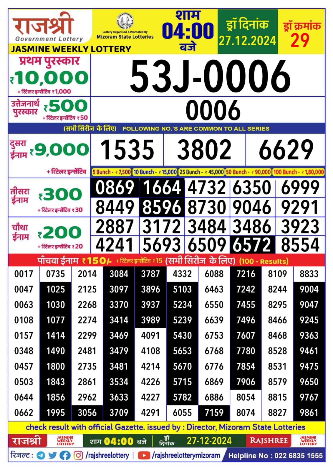 राजश्री लाटरी का 4 बजे का रिज़ल्ट दिनांक 13.10.25