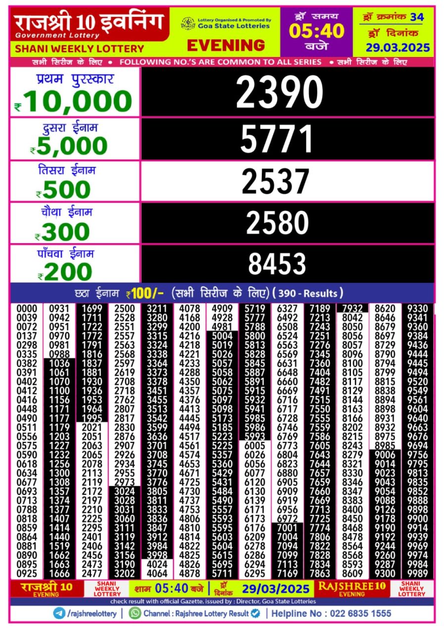 राजश्री 10 लाटरी का का शाम 5.40 बजे का रिज़ल्ट दिनांक 13.11.25