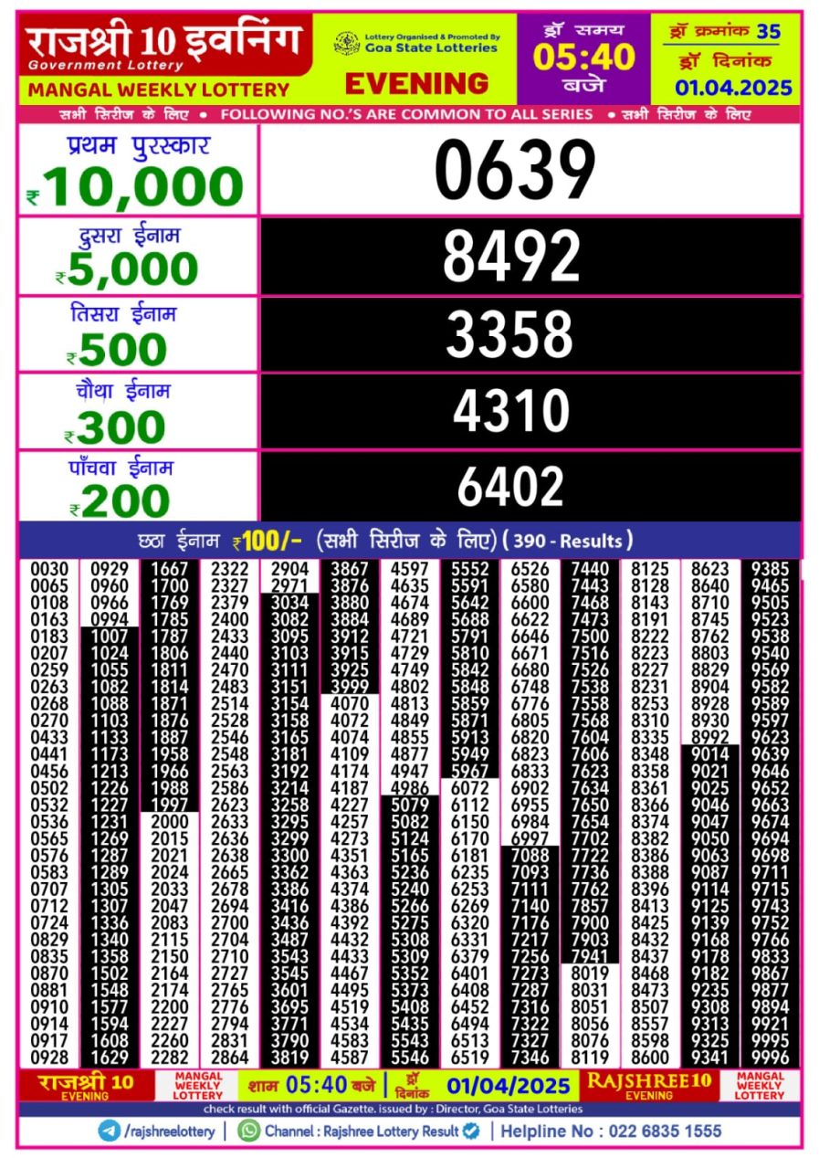 राजश्री 10 लाटरी का का शाम 5.40 बजे का रिज़ल्ट दिनांक 16.11.25