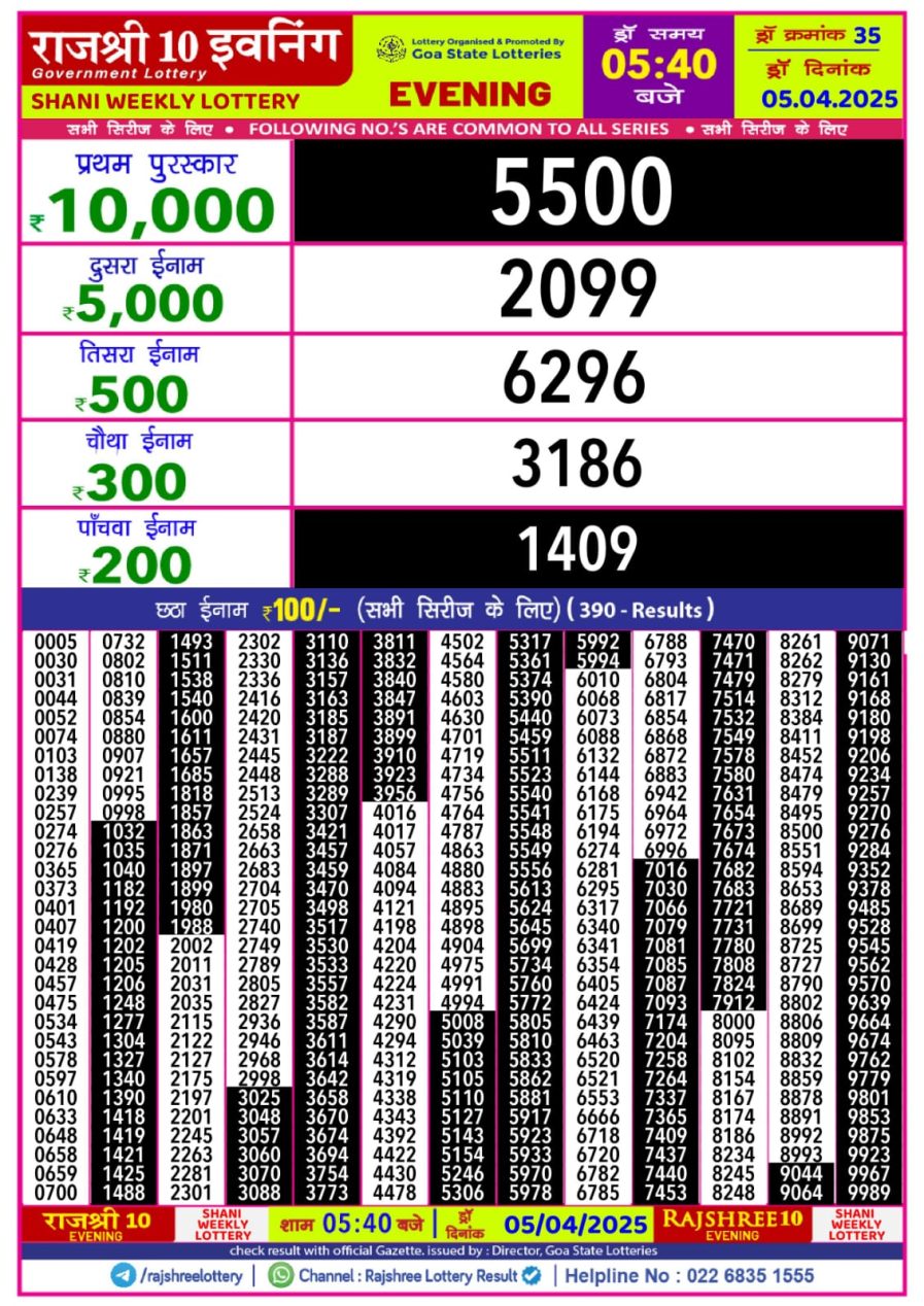 राजश्री 10 लाटरी का का शाम 5.40 बजे का रिज़ल्ट दिनांक 20.11.25