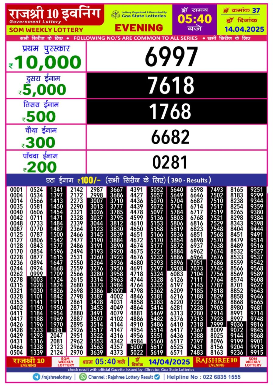 राजश्री 10 लाटरी का का शाम 5.40 बजे का रिज़ल्ट दिनांक 24.11.25