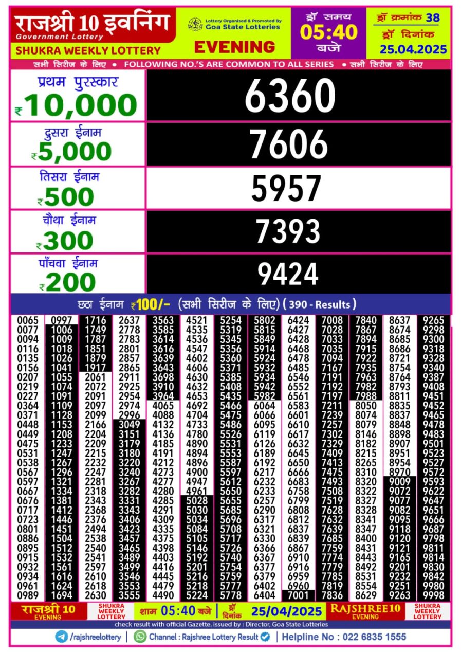 राजश्री 10 लाटरी का का शाम 5.40 बजे का रिज़ल्ट दिनांक 05.12.25
