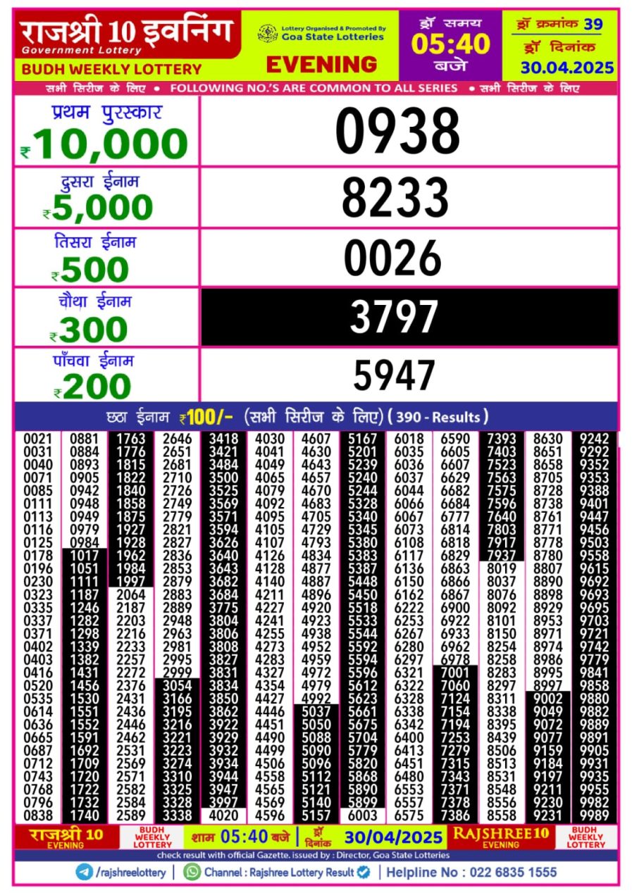 राजश्री 10 लाटरी का का शाम 5.40 बजे का रिज़ल्ट दिनांक 10.12.25