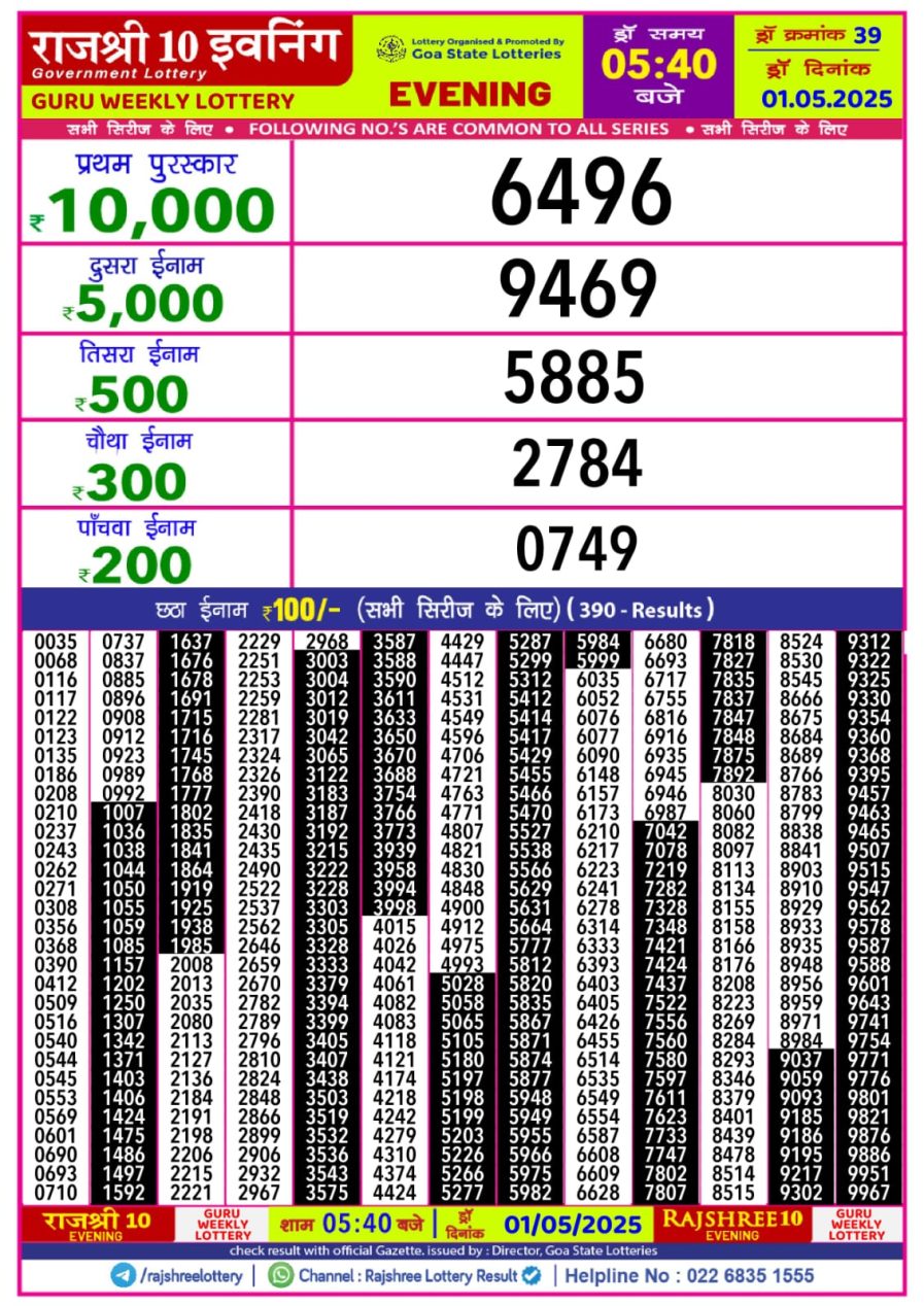 राजश्री 10 लाटरी का का शाम 5.40 बजे का रिज़ल्ट दिनांक 11.12.25