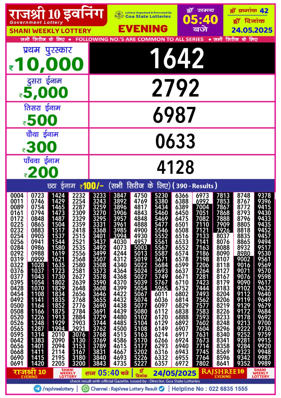 राजश्री 10 लाटरी का का शाम 5.40 बजे का रिज़ल्ट दिनांक 24.5.25