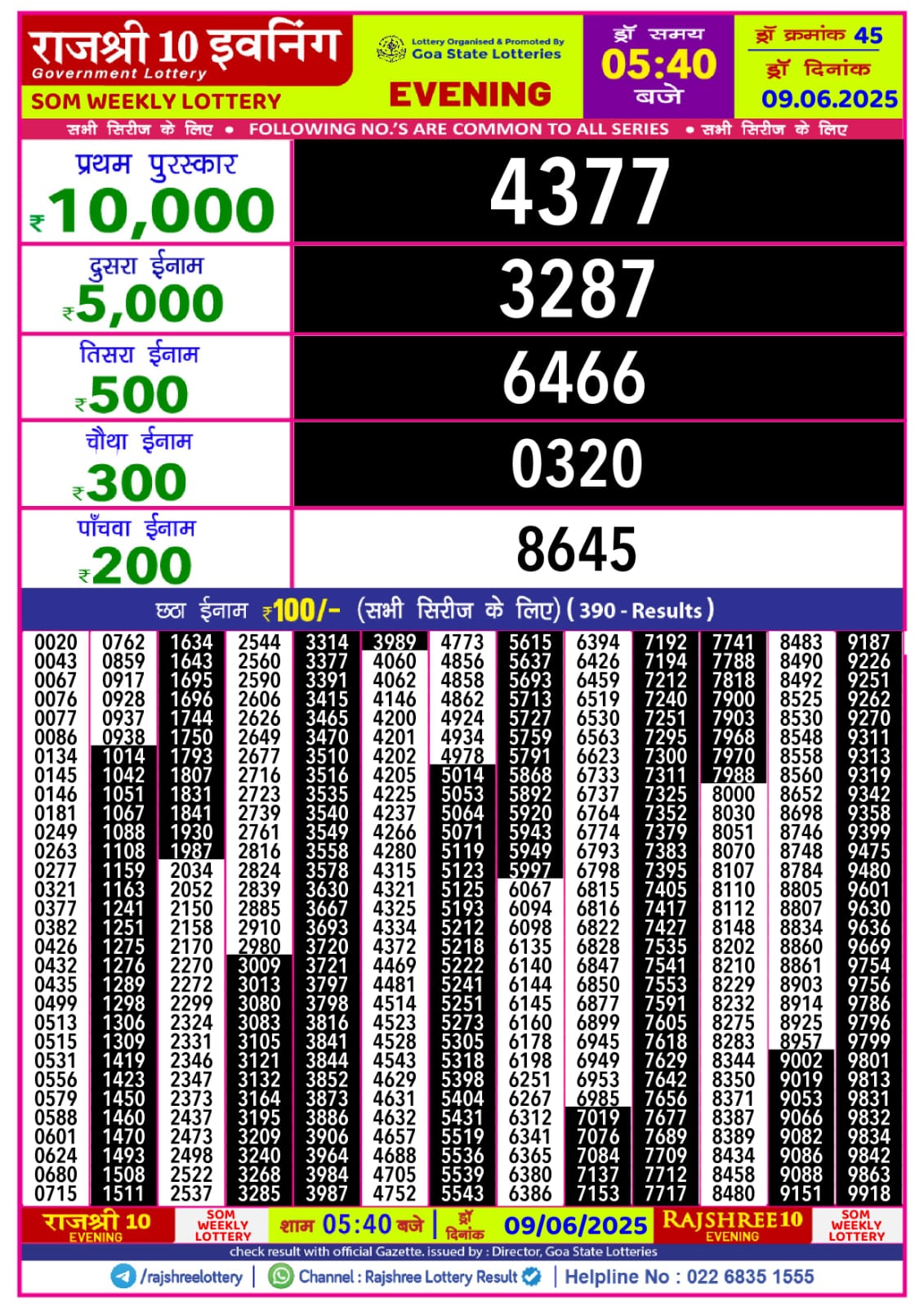 राजश्री 10 लाटरी का का शाम 5.40 बजे का रिज़ल्ट दिनांक 9.6.25