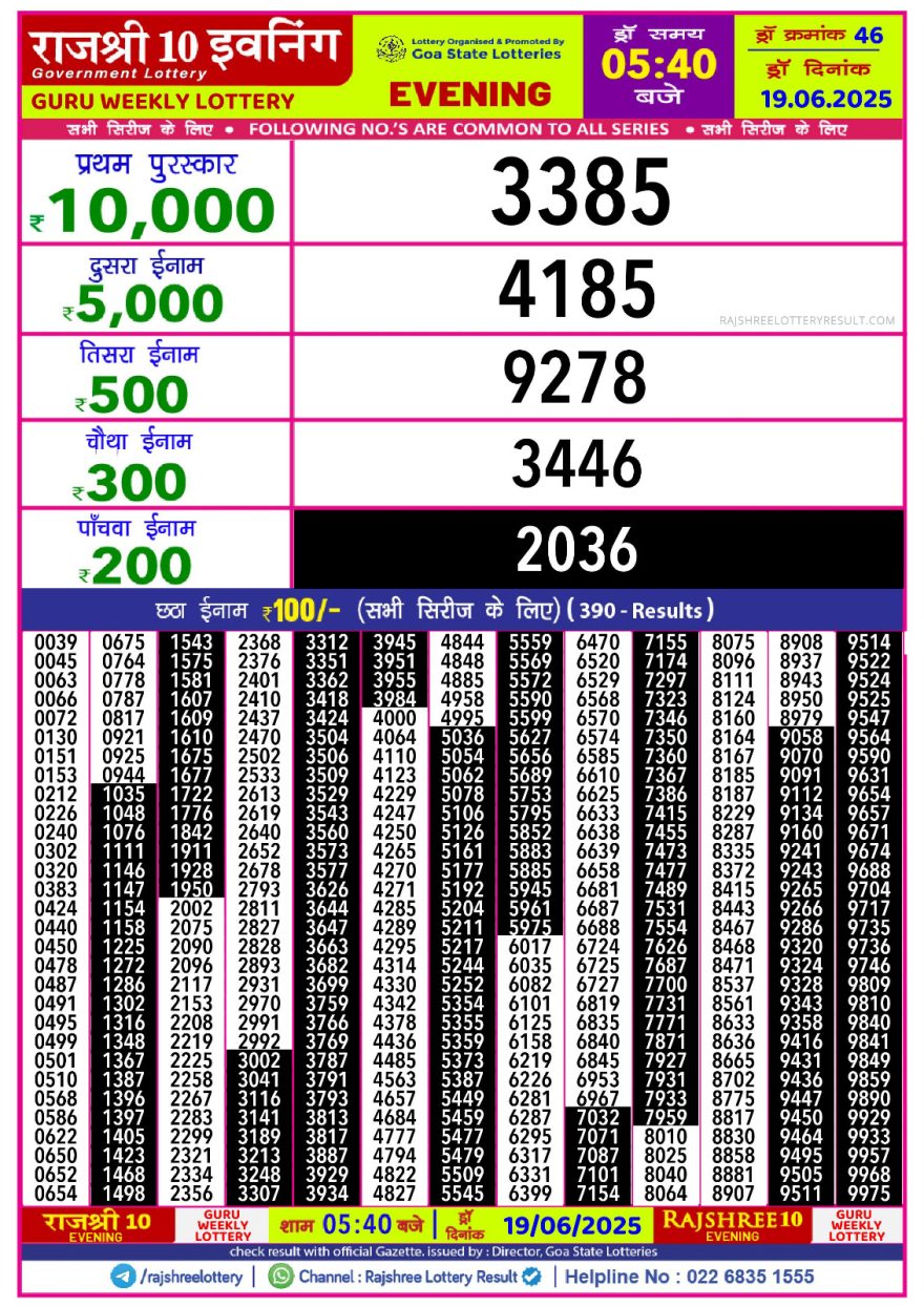 राजश्री 10 लाटरी का का शाम 5.40 बजे का रिज़ल्ट दिनांक 19.6.25