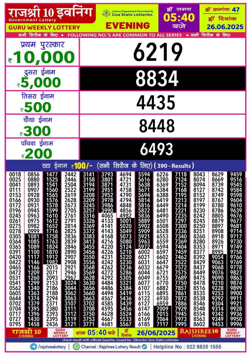 राजश्री 10 लाटरी का का शाम 5.40 बजे का रिज़ल्ट दिनांक 26.6.25